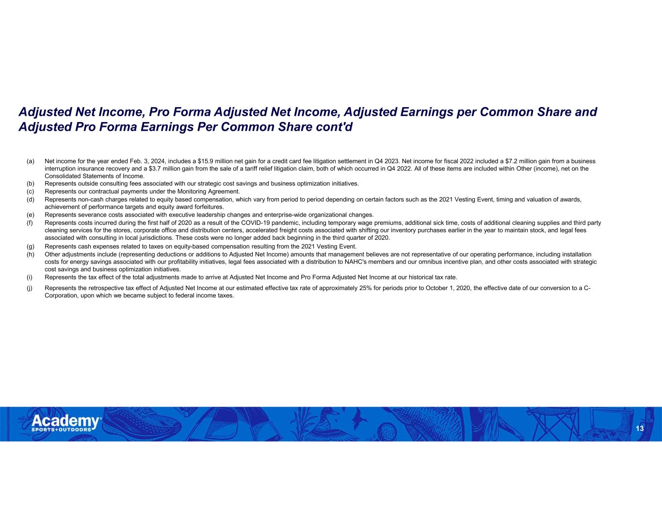 13 Net income for the year ended Feb. 3, 2024, includes a $15.9 million net gain for a credit card fee litigation settlement in Q4 2023. Net income for fiscal 2022 included a $7.2 million gain from a business interruption insurance recovery and a $3.7 million gain from the sale of a tariff relief litigation claim, both of which occurred in Q4 2022. All of these items are included within Other (income), net on the Consolidated Statements of Income. Represents outside consulting fees associated with our strategic cost savings and business optimization initiatives. (a) (b) Represents our contractual payments under the Monitoring Agreement.(c) Represents non-cash charges related to equity based compensation, which vary from period to period depending on certain factors such as the 2021 Vesting Event, timing and valuation of awards, achievement of performance targets and equity award forfeitures. (d) Represents severance costs associated with executive leadership changes and enterprise-wide organizational changes.(e) Represents costs incurred during the first half of 2020 as a result of the COVID-19 pandemic, including temporary wage premiums, additional sick time, costs of additional cleaning supplies and third party cleaning services for the stores, corporate office and distribution centers, accelerated freight costs associated with shifting our inventory purchases earlier in the year to maintain stock, and legal fees associated with consulting in local jurisdictions. These costs were no longer added back beginning in the third quarter of 2020. (f) Represents cash expenses related to taxes on equity-based compensation resulting from the 2021 Vesting Event.(g) Other adjustments include (representing deductions or additions to Adjusted Net Income) amounts that management believes are not representative of our operating performance, including installation costs for energy savings associated with our profitability initiatives, legal fees associated with a distribution to NAHC's members and our omnibus incentive plan, and other costs associated with strategic cost savings and business optimization initiatives. (h) Represents the tax effect of the total adjustments made to arrive at Adjusted Net Income and Pro Forma Adjusted Net Income at our historical tax rate.(i) Represents the retrospective tax effect of Adjusted Net Income at our estimated effective tax rate of approximately 25% for periods prior to October 1, 2020, the effective date of our conversion to a C- Corporation, upon which we became subject to federal income taxes. (j) Adjusted Net Income, Pro Forma Adjusted Net Income, Adjusted Earnings per Common Share and Adjusted Pro Forma Earnings Per Common Share cont'd