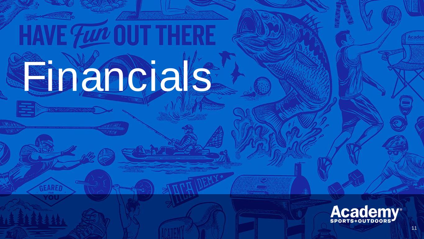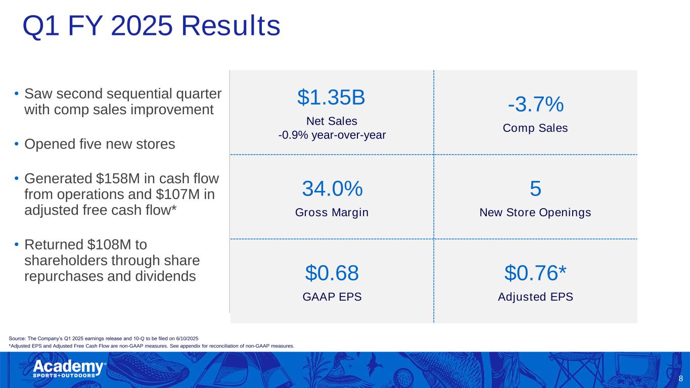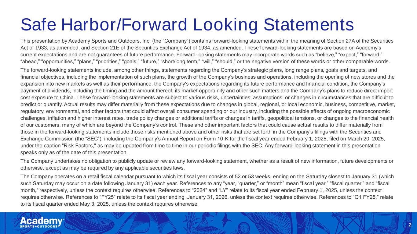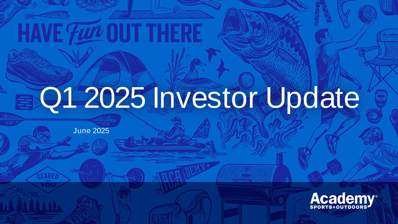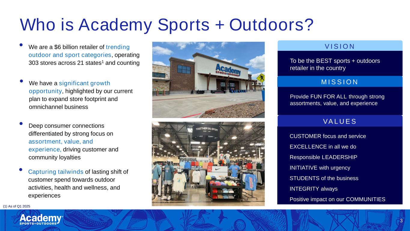 Safe Harbor/Forward Looking Statements 2 This presentation by Academy Sports and Outdoors, Inc. (the “Company”) contains forward-looking statements within the meaning of Section 27A of the Securities Act of 1933, as amended, and Section 21E of the Securities Exchange Act of 1934, as amended. These forward-looking statements are based on Academy’s current expectations and are not guarantees of future performance. Forward-looking statements may incorporate words such as “believe,” “expect,” “forward,” “ahead,” “opportunities,” “plans,” “priorities,” “goals,” “future,” “short/long term,” “will,” “should,” or the negative version of these words or other comparable words. The forward-looking statements include, among other things, statements regarding the Company’s strategic plans, long range plans, goals and targets, and financial objectives, including the implementation of such plans, the growth of the Company’s business and operations, including the opening of new stores and the expansion into new markets as well as their performance, the Company's expectations regarding its future performance and financial condition, the Company’s payment of dividends, including the timing and the amount thereof, its market opportunity and other such matters and the Company’s plans to reduce direct import cost exposure to China. These forward-looking statements are subject to various risks, uncertainties, assumptions, or changes in circumstances that are difficult to predict or quantify. Actual results may differ materially from these expectations due to changes in global, regional, or local economic, business, competitive, market, regulatory, environmental, and other factors that could affect overall consumer spending or our industry, including the possible effects of ongoing macroeconomic challenges, inflation and higher interest rates, trade policy changes or additional tariffs or changes in tariffs, geopolitical tensions, or changes to the financial health of our customers, many of which are beyond the Company’s control. These and other important factors that could cause actual results to differ materially from those in the forward-looking statements include those risks mentioned above and other risks that are set forth in the Company's filings with the Securities and Exchange Commission (the “SEC”), including the Company’s Annual Report on Form 10-K for the fiscal year ended February 1, 2025, filed on March 20, 2025, under the caption “Risk Factors," as may be updated from time to time in our periodic filings with the SEC. Any forward-looking statement in this presentation speaks only as of the date of this presentation. The Company undertakes no obligation to publicly update or review any forward-looking statement, whether as a result of new information, future developments or otherwise, except as may be required by any applicable securities laws. The Company operates on a retail fiscal calendar pursuant to which its fiscal year consists of 52 or 53 weeks, ending on the Saturday closest to January 31 (which such Saturday may occur on a date following January 31) each year. References to any “year, “quarter,” or “month” mean “fiscal year,” “fiscal quarter,” and “fiscal month,” respectively, unless the context requires otherwise. References to “2024” and “LY” relate to its fiscal year ended February 1, 2025, unless the context requires otherwise. References to “FY25” relate to its fiscal year ending January 31, 2026, unless the context requires otherwise. References to “Q1 FY25,” relate to its fiscal quarter ended May 3, 2025, unless the context requires otherwise.