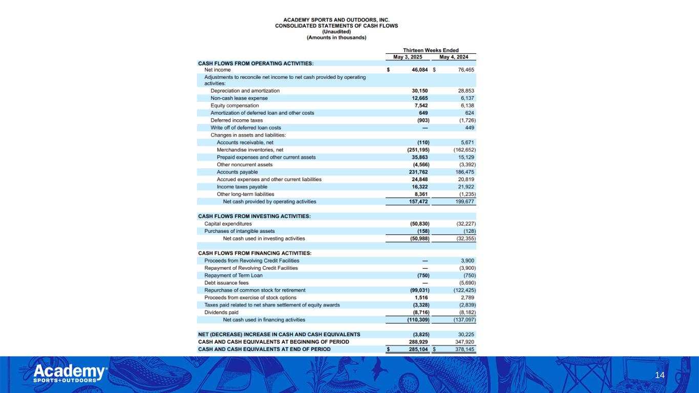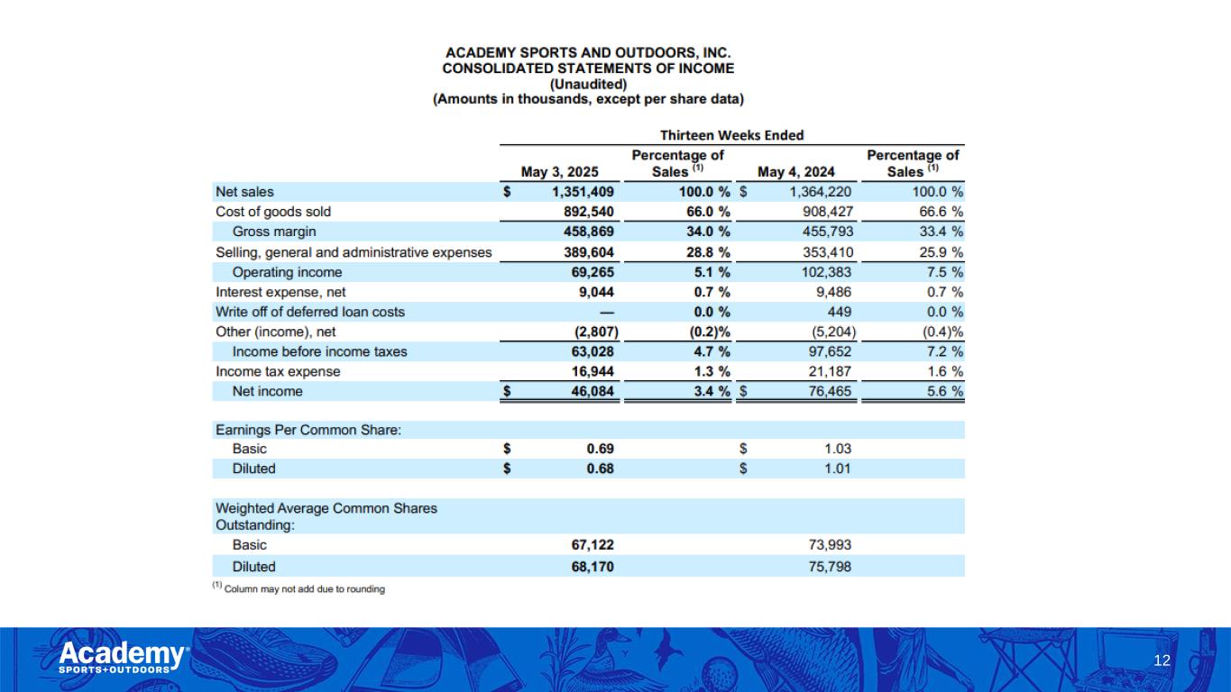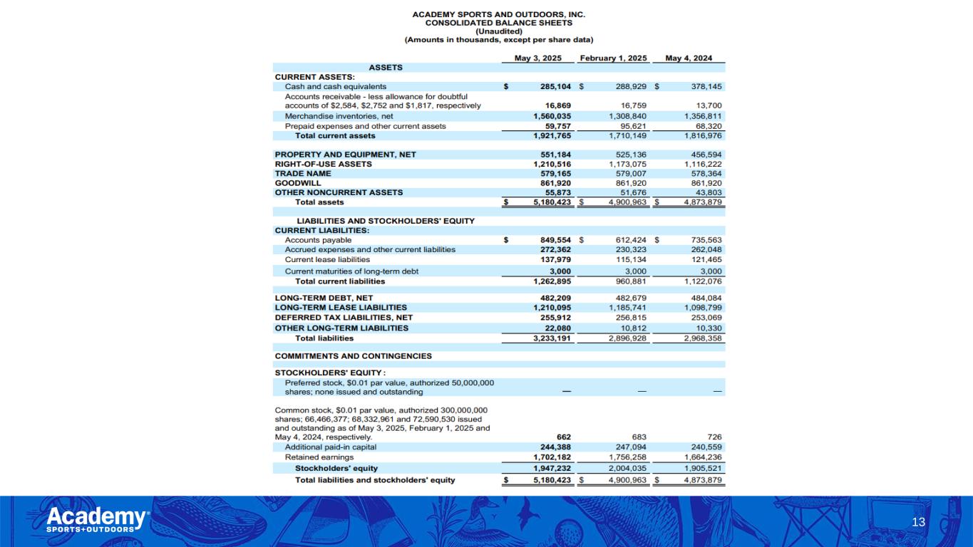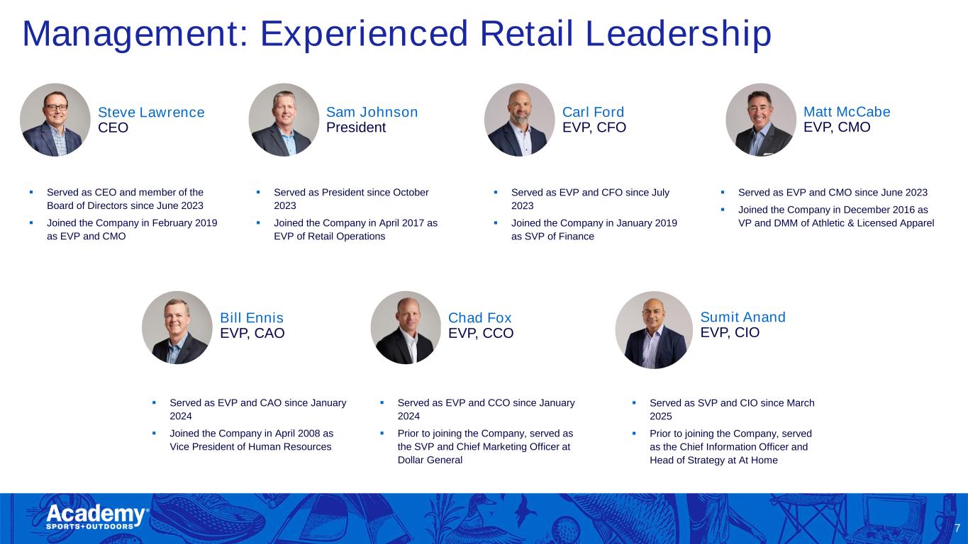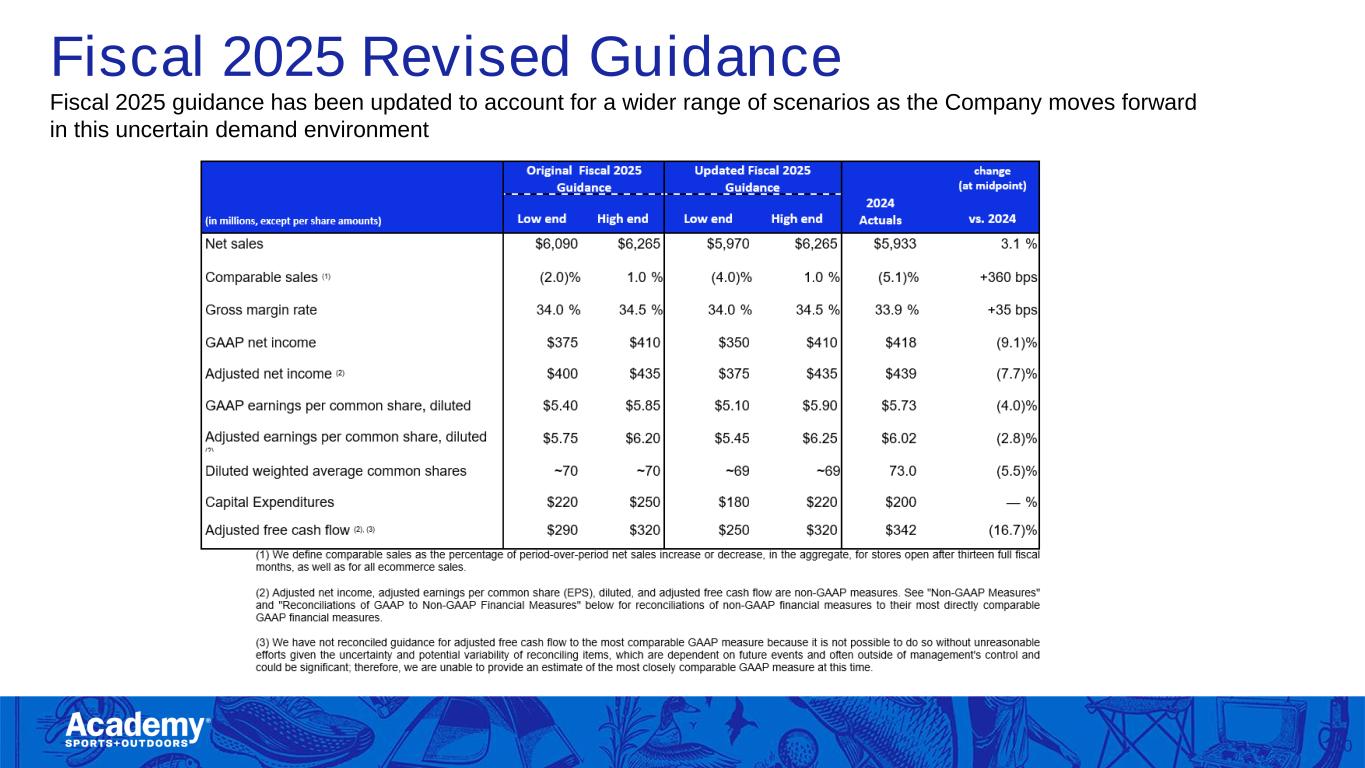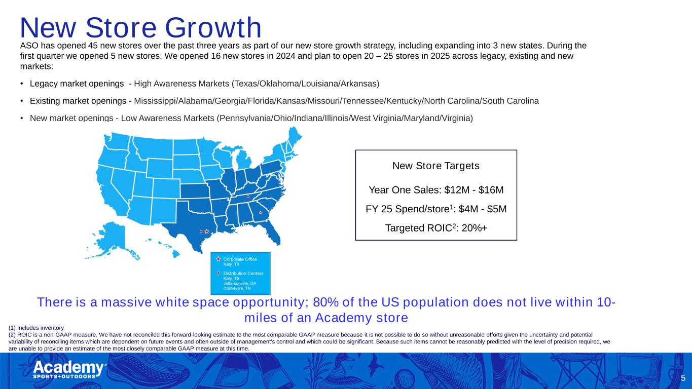 Safe Harbor/Forward Looking Statements 2 This presentation by Academy Sports and Outdoors, Inc. (the “Company”) contains forward-looking statements within the meaning of Section 27A of the Securities Act of 1933, as amended, and Section 21E of the Securities Exchange Act of 1934, as amended. These forward-looking statements are based on Academy’s current expectations and are not guarantees of future performance. Forward-looking statements may incorporate words such as “believe,” “expect,” “forward,” “ahead,” “opportunities,” “plans,” “priorities,” “goals,” “future,” “short/long term,” “will,” “should,” or the negative version of these words or other comparable words. The forward-looking statements include, among other things, statements regarding the Company’s strategic plans, long range plans, goals and targets, and financial objectives, including the implementation of such plans, the growth of the Company’s business and operations, including the opening of new stores and the expansion into new markets as well as their performance, the Company's expectations regarding its future performance and financial condition, the Company’s payment of dividends, including the timing and the amount thereof, its market opportunity and other such matters and the Company’s plans to reduce direct import cost exposure to China. These forward-looking statements are subject to various risks, uncertainties, assumptions, or changes in circumstances that are difficult to predict or quantify. Actual results may differ materially from these expectations due to changes in global, regional, or local economic, business, competitive, market, regulatory, environmental, and other factors that could affect overall consumer spending or our industry, including the possible effects of ongoing macroeconomic challenges, inflation and higher interest rates, trade policy changes or additional tariffs or changes in tariffs, geopolitical tensions, or changes to the financial health of our customers, many of which are beyond the Company’s control. These and other important factors that could cause actual results to differ materially from those in the forward-looking statements include those risks mentioned above and other risks that are set forth in the Company's filings with the Securities and Exchange Commission (the “SEC”), including the Company’s Annual Report on Form 10-K for the fiscal year ended February 1, 2025, filed on March 20, 2025, under the caption “Risk Factors," as may be updated from time to time in our periodic filings with the SEC. Any forward-looking statement in this presentation speaks only as of the date of this presentation. The Company undertakes no obligation to publicly update or review any forward-looking statement, whether as a result of new information, future developments or otherwise, except as may be required by any applicable securities laws. The Company operates on a retail fiscal calendar pursuant to which its fiscal year consists of 52 or 53 weeks, ending on the Saturday closest to January 31 (which such Saturday may occur on a date following January 31) each year. References to any “year, “quarter,” or “month” mean “fiscal year,” “fiscal quarter,” and “fiscal month,” respectively, unless the context requires otherwise. References to “2024” and “LY” relate to its fiscal year ended February 1, 2025, unless the context requires otherwise. References to “FY25” relate to its fiscal year ending January 31, 2026, unless the context requires otherwise. References to “Q1 FY25,” relate to its fiscal quarter ended May 3, 2025, unless the context requires otherwise.