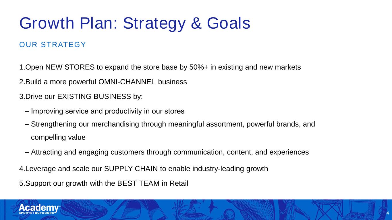 Who is Academy Sports + Outdoors? 3 • We are a $6 billion retailer of trending outdoor and sport categories, operating 303 stores across 21 states1 and counting • We have a significant growth opportunity, highlighted by our current plan to expand store footprint and omnichannel business • Deep consumer connections differentiated by strong focus on assortment, value, and experience, driving customer and community loyalties • Capturing tailwinds of lasting shift of customer spend towards outdoor activities, health and wellness, and experiences V I S I O N To be the BEST sports + outdoors retailer in the country M I S S I O N Provide FUN FOR ALL through strong assortments, value, and experience CUSTOMER focus and service EXCELLENCE in all we do Responsible LEADERSHIP INITIATIVE with urgency STUDENTS of the business INTEGRITY always Positive impact on our COMMUNITIES VA L U E S (1) As of Q1 2025