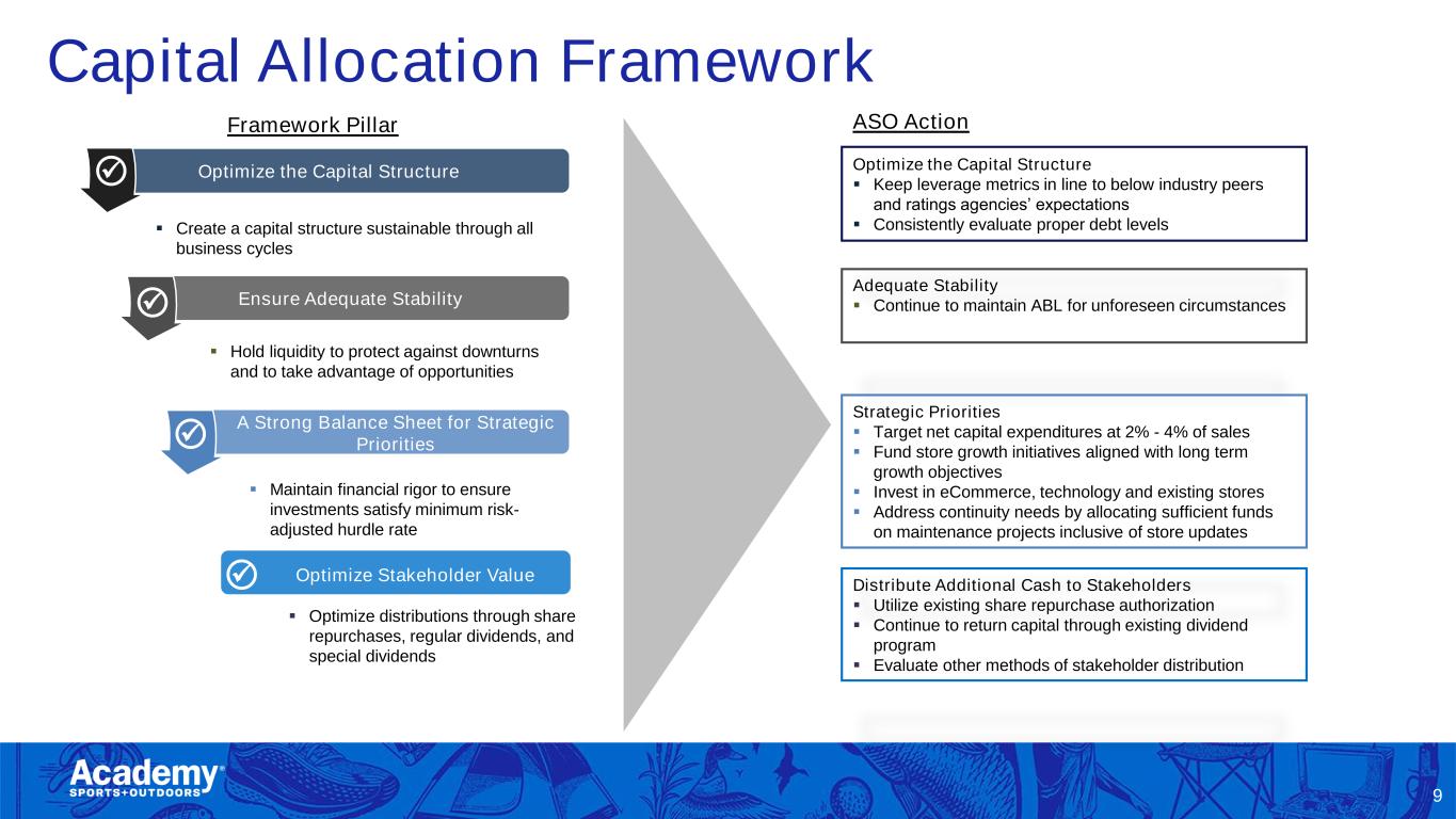 Q1 FY 2025 Results 8 $1.35B Net Sales -0.9% year-over-year -3.7% Comp Sales 34.0% Gross Margin 5 New Store Openings $0.68 GAAP EPS $0.76* Adjusted EPS Source: The Company’s Q1 2025 earnings release and 10-Q to be filed on 6/10/2025 *Adjusted EPS and Adjusted Free Cash Flow are non-GAAP measures. See appendix for reconciliation of non-GAAP measures. • Saw second sequential quarter with comp sales improvement • Opened five new stores • Generated $158M in cash flow from operations and $107M in adjusted free cash flow* • Returned $108M to shareholders through share repurchases and dividends