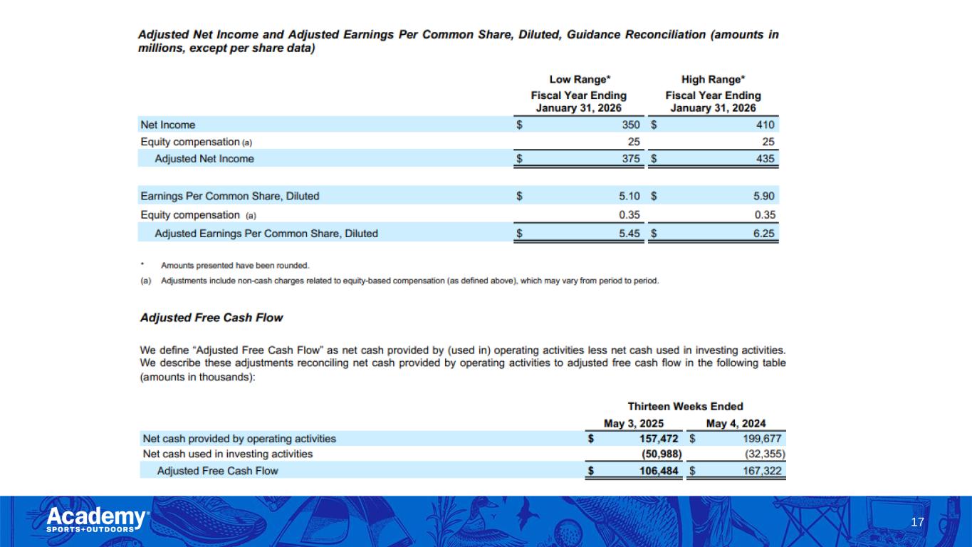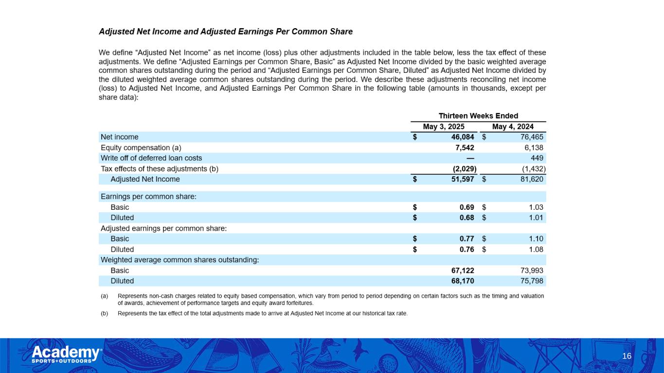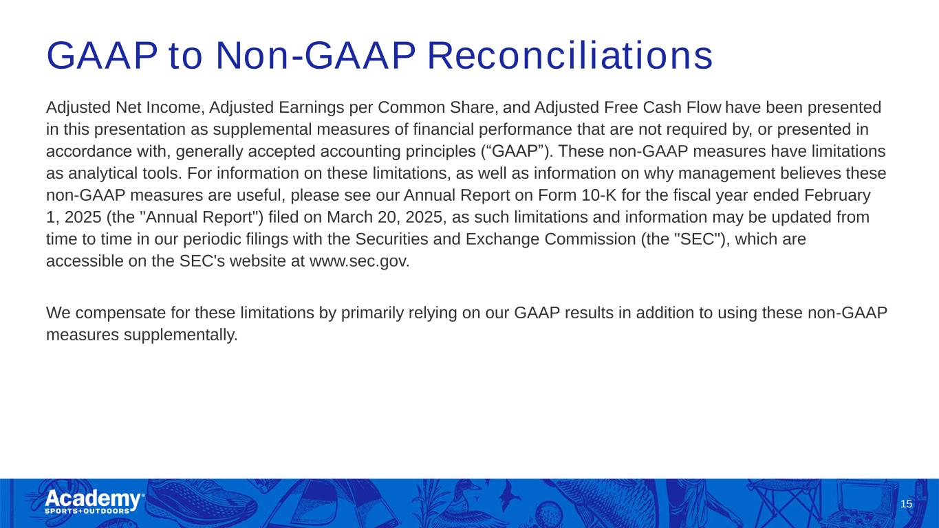 GAAP to Non-GAAP Reconciliations Adjusted Net Income, Adjusted Earnings per Common Share, and Adjusted Free Cash Flow have been presented in this presentation as supplemental measures of financial performance that are not required by, or presented in accordance with, generally accepted accounting principles (“GAAP”). These non-GAAP measures have limitations as analytical tools. For information on these limitations, as well as information on why management believes these non-GAAP measures are useful, please see our Annual Report on Form 10-K for the fiscal year ended February 1, 2025 (the "Annual Report") filed on March 20, 2025, as such limitations and information may be updated from time to time in our periodic filings with the Securities and Exchange Commission (the "SEC"), which are accessible on the SEC's website at www.sec.gov. We compensate for these limitations by primarily relying on our GAAP results in addition to using these non-GAAP measures supplementally. 15
