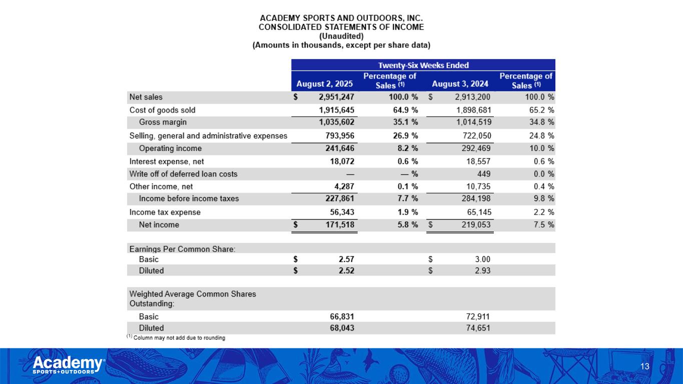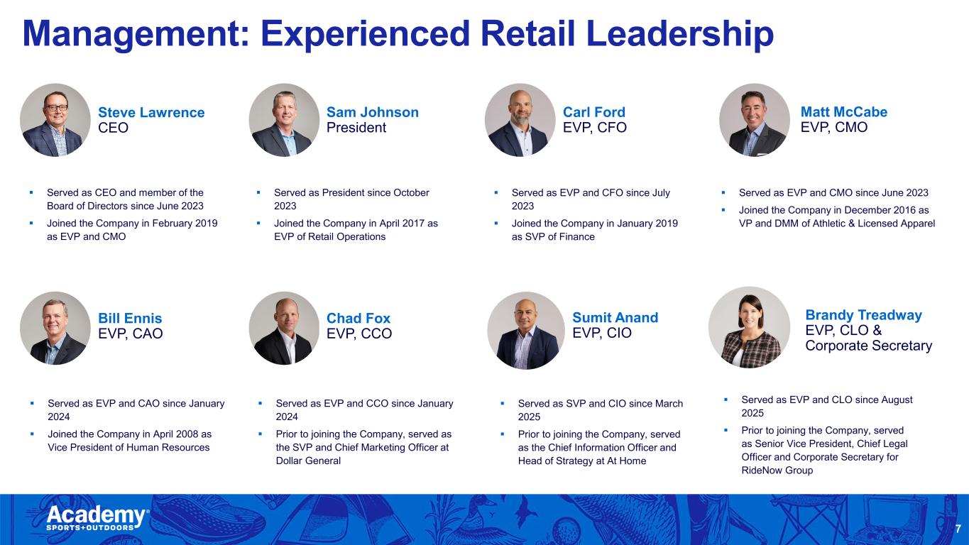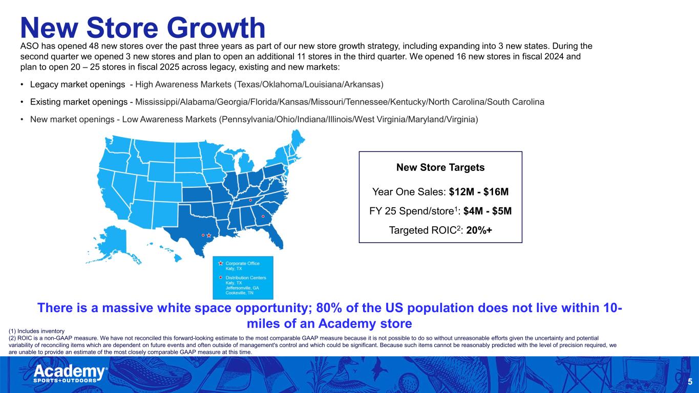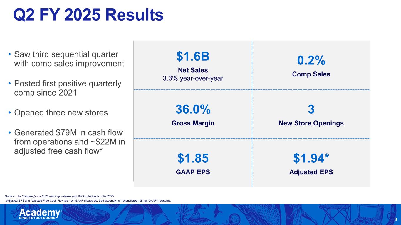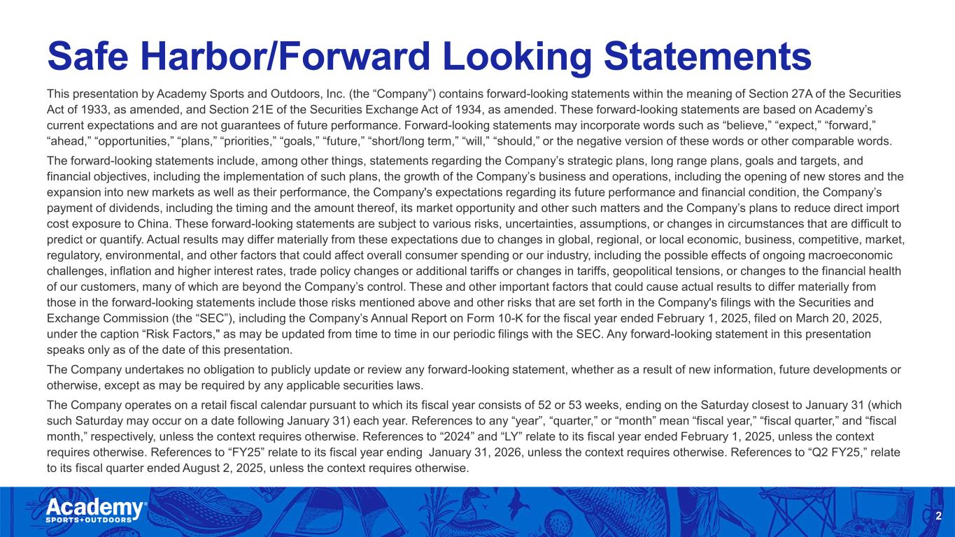 Safe Harbor/Forward Looking Statements 2 This presentation by Academy Sports and Outdoors, Inc. (the “Company”) contains forward-looking statements within the meaning of Section 27A of the Securities Act of 1933, as amended, and Section 21E of the Securities Exchange Act of 1934, as amended. These forward-looking statements are based on Academy’s current expectations and are not guarantees of future performance. Forward-looking statements may incorporate words such as “believe,” “expect,” “forward,” “ahead,” “opportunities,” “plans,” “priorities,” “goals,” “future,” “short/long term,” “will,” “should,” or the negative version of these words or other comparable words. The forward-looking statements include, among other things, statements regarding the Company’s strategic plans, long range plans, goals and targets, and financial objectives, including the implementation of such plans, the growth of the Company’s business and operations, including the opening of new stores and the expansion into new markets as well as their performance, the Company's expectations regarding its future performance and financial condition, the Company’s payment of dividends, including the timing and the amount thereof, its market opportunity and other such matters and the Company’s plans to reduce direct import cost exposure to China. These forward-looking statements are subject to various risks, uncertainties, assumptions, or changes in circumstances that are difficult to predict or quantify. Actual results may differ materially from these expectations due to changes in global, regional, or local economic, business, competitive, market, regulatory, environmental, and other factors that could affect overall consumer spending or our industry, including the possible effects of ongoing macroeconomic challenges, inflation and higher interest rates, trade policy changes or additional tariffs or changes in tariffs, geopolitical tensions, or changes to the financial health of our customers, many of which are beyond the Company’s control. These and other important factors that could cause actual results to differ materially from those in the forward-looking statements include those risks mentioned above and other risks that are set forth in the Company's filings with the Securities and Exchange Commission (the “SEC”), including the Company’s Annual Report on Form 10-K for the fiscal year ended February 1, 2025, filed on March 20, 2025, under the caption “Risk Factors," as may be updated from time to time in our periodic filings with the SEC. Any forward-looking statement in this presentation speaks only as of the date of this presentation. The Company undertakes no obligation to publicly update or review any forward-looking statement, whether as a result of new information, future developments or otherwise, except as may be required by any applicable securities laws. The Company operates on a retail fiscal calendar pursuant to which its fiscal year consists of 52 or 53 weeks, ending on the Saturday closest to January 31 (which such Saturday may occur on a date following January 31) each year. References to any “year”, “quarter,” or “month” mean “fiscal year,” “fiscal quarter,” and “fiscal month,” respectively, unless the context requires otherwise. References to “2024” and “LY” relate to its fiscal year ended February 1, 2025, unless the context requires otherwise. References to “FY25” relate to its fiscal year ending January 31, 2026, unless the context requires otherwise. References to “Q2 FY25,” relate to its fiscal quarter ended August 2, 2025, unless the context requires otherwise.