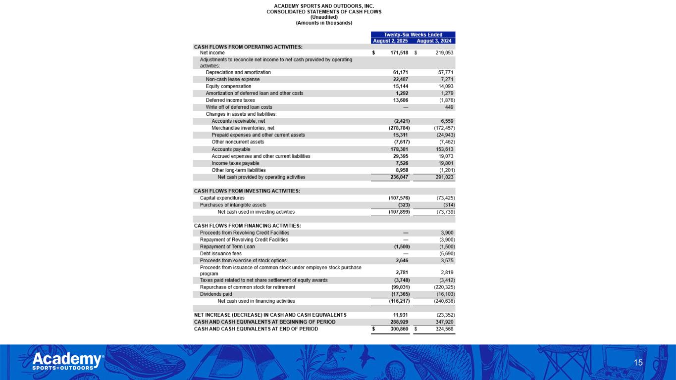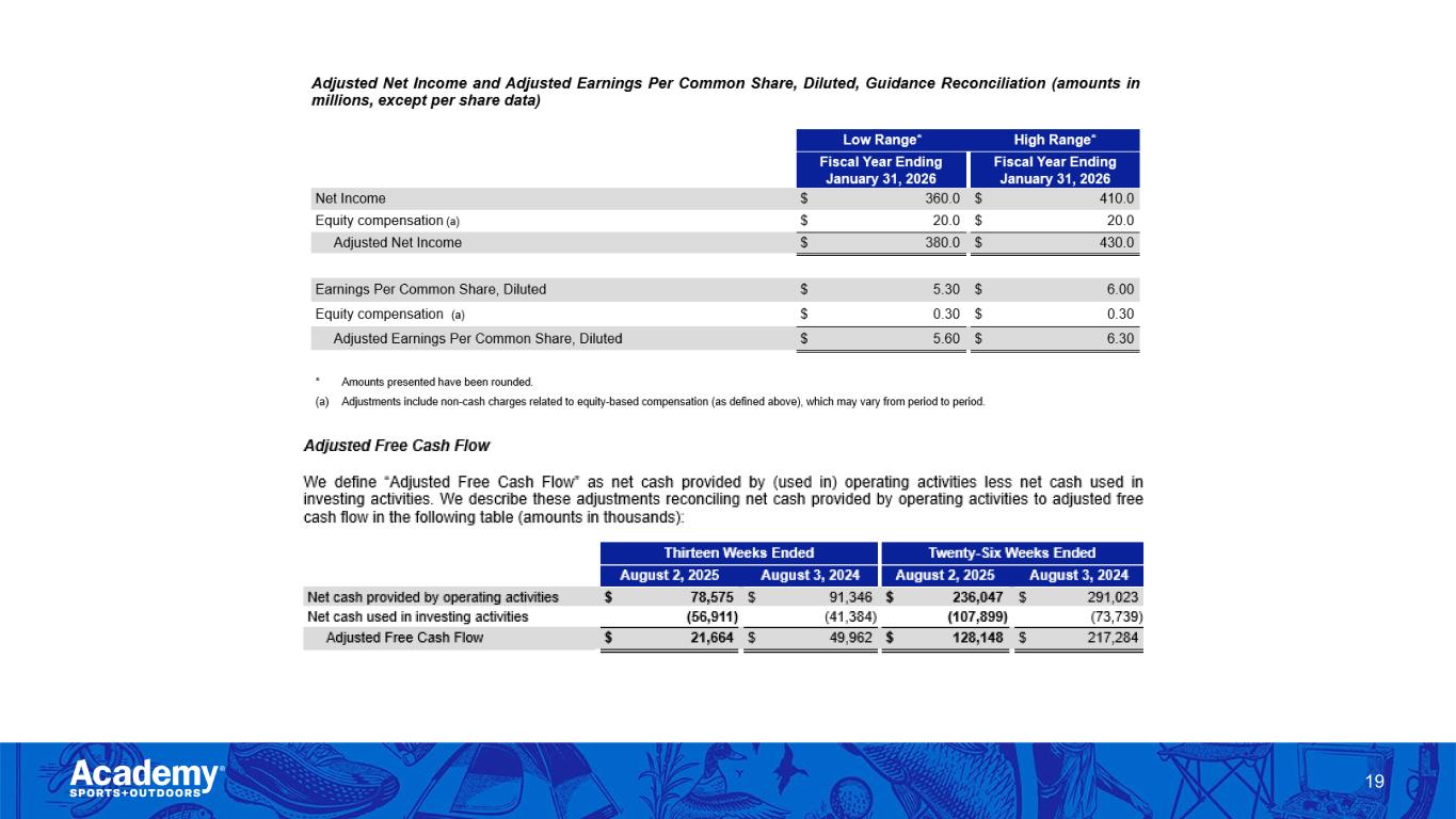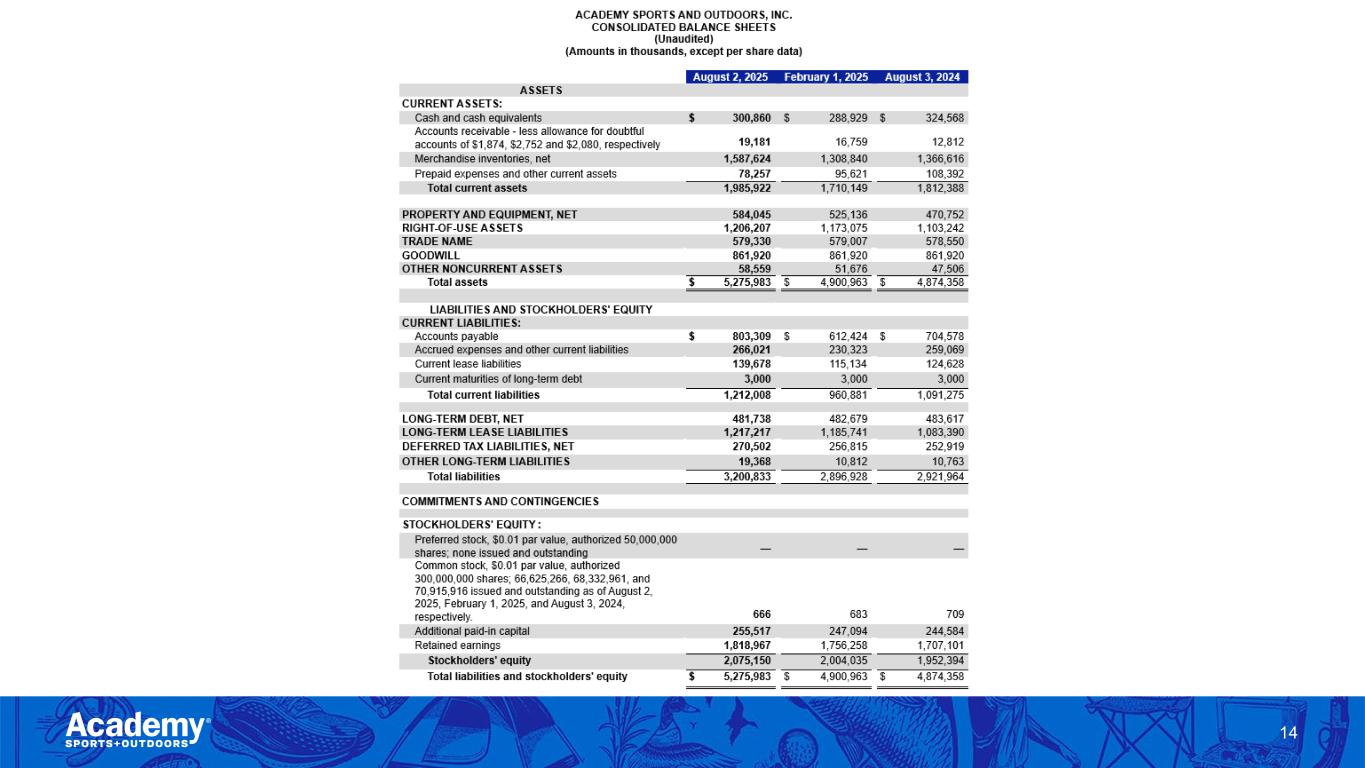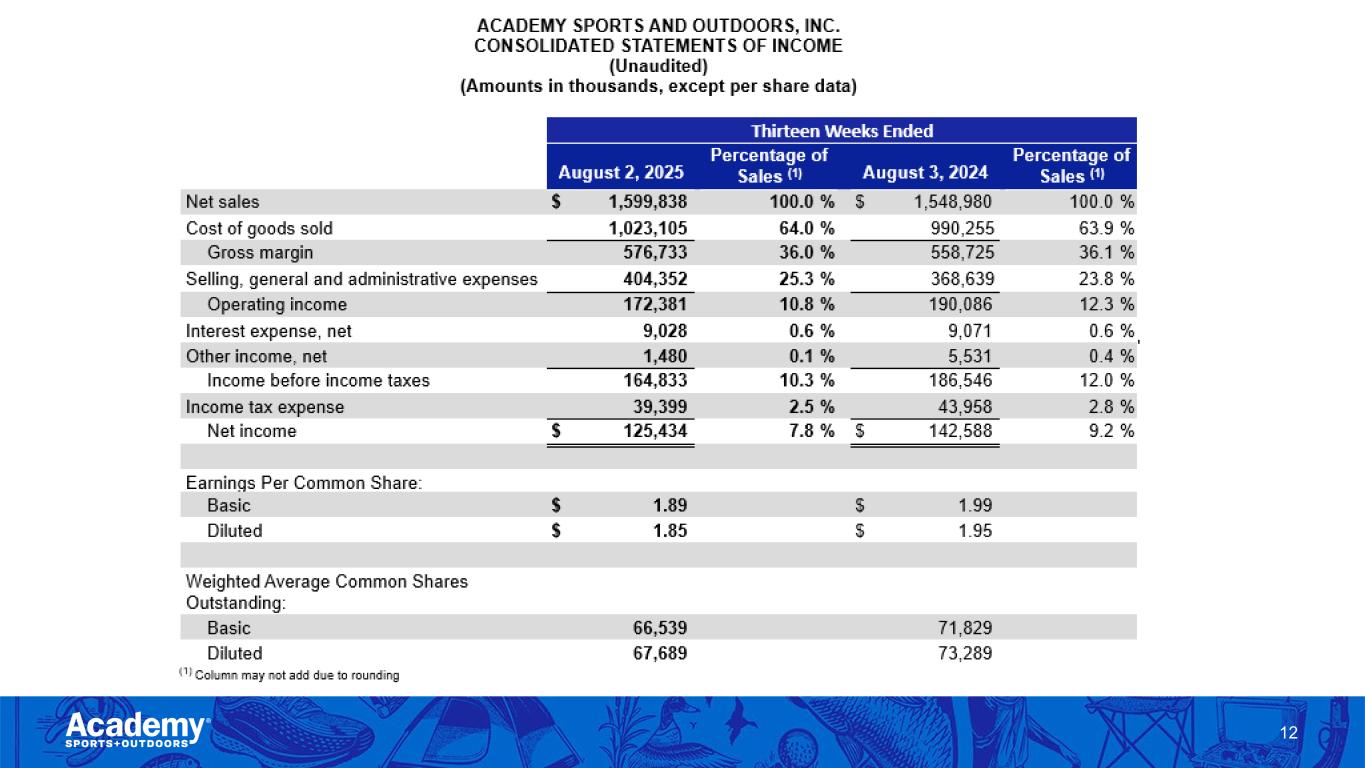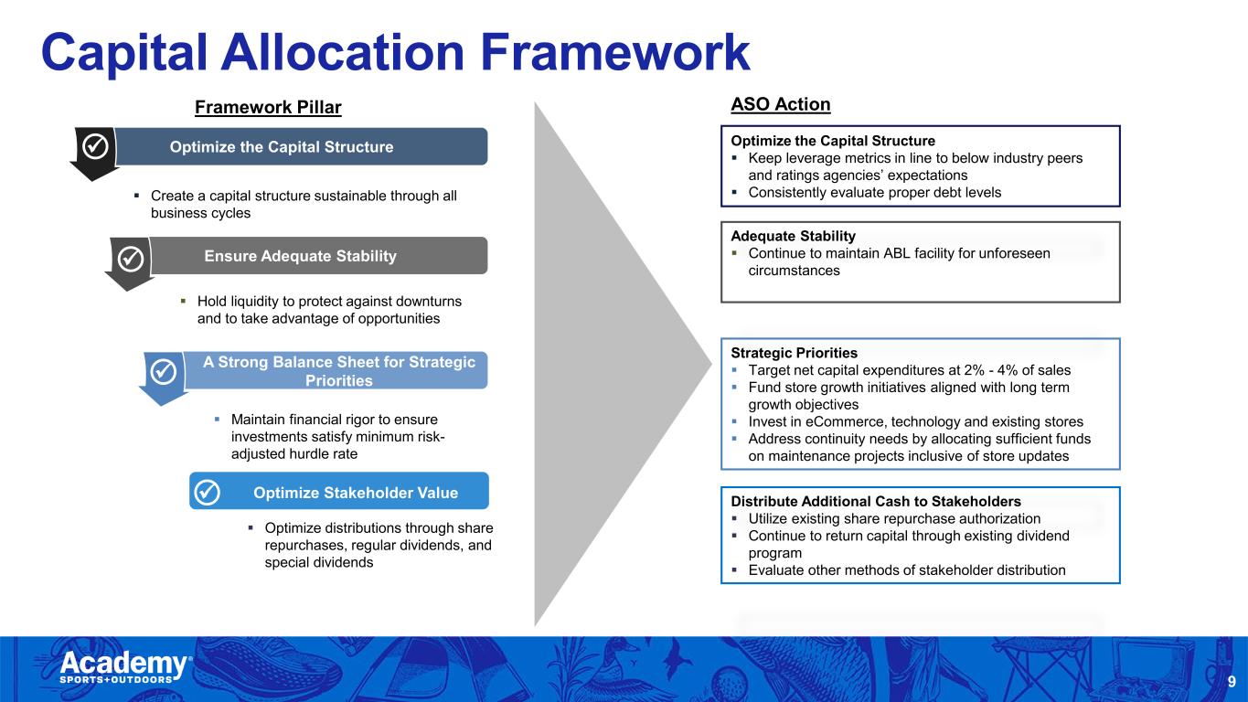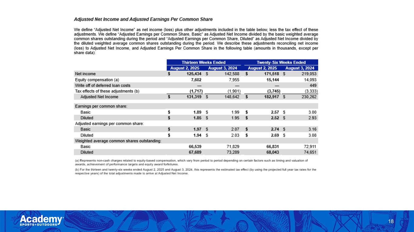 Safe Harbor/Forward Looking Statements 2 This presentation by Academy Sports and Outdoors, Inc. (the “Company”) contains forward-looking statements within the meaning of Section 27A of the Securities Act of 1933, as amended, and Section 21E of the Securities Exchange Act of 1934, as amended. These forward-looking statements are based on Academy’s current expectations and are not guarantees of future performance. Forward-looking statements may incorporate words such as “believe,” “expect,” “forward,” “ahead,” “opportunities,” “plans,” “priorities,” “goals,” “future,” “short/long term,” “will,” “should,” or the negative version of these words or other comparable words. The forward-looking statements include, among other things, statements regarding the Company’s strategic plans, long range plans, goals and targets, and financial objectives, including the implementation of such plans, the growth of the Company’s business and operations, including the opening of new stores and the expansion into new markets as well as their performance, the Company's expectations regarding its future performance and financial condition, the Company’s payment of dividends, including the timing and the amount thereof, its market opportunity and other such matters and the Company’s plans to reduce direct import cost exposure to China. These forward-looking statements are subject to various risks, uncertainties, assumptions, or changes in circumstances that are difficult to predict or quantify. Actual results may differ materially from these expectations due to changes in global, regional, or local economic, business, competitive, market, regulatory, environmental, and other factors that could affect overall consumer spending or our industry, including the possible effects of ongoing macroeconomic challenges, inflation and higher interest rates, trade policy changes or additional tariffs or changes in tariffs, geopolitical tensions, or changes to the financial health of our customers, many of which are beyond the Company’s control. These and other important factors that could cause actual results to differ materially from those in the forward-looking statements include those risks mentioned above and other risks that are set forth in the Company's filings with the Securities and Exchange Commission (the “SEC”), including the Company’s Annual Report on Form 10-K for the fiscal year ended February 1, 2025, filed on March 20, 2025, under the caption “Risk Factors," as may be updated from time to time in our periodic filings with the SEC. Any forward-looking statement in this presentation speaks only as of the date of this presentation. The Company undertakes no obligation to publicly update or review any forward-looking statement, whether as a result of new information, future developments or otherwise, except as may be required by any applicable securities laws. The Company operates on a retail fiscal calendar pursuant to which its fiscal year consists of 52 or 53 weeks, ending on the Saturday closest to January 31 (which such Saturday may occur on a date following January 31) each year. References to any “year”, “quarter,” or “month” mean “fiscal year,” “fiscal quarter,” and “fiscal month,” respectively, unless the context requires otherwise. References to “2024” and “LY” relate to its fiscal year ended February 1, 2025, unless the context requires otherwise. References to “FY25” relate to its fiscal year ending January 31, 2026, unless the context requires otherwise. References to “Q2 FY25,” relate to its fiscal quarter ended August 2, 2025, unless the context requires otherwise.