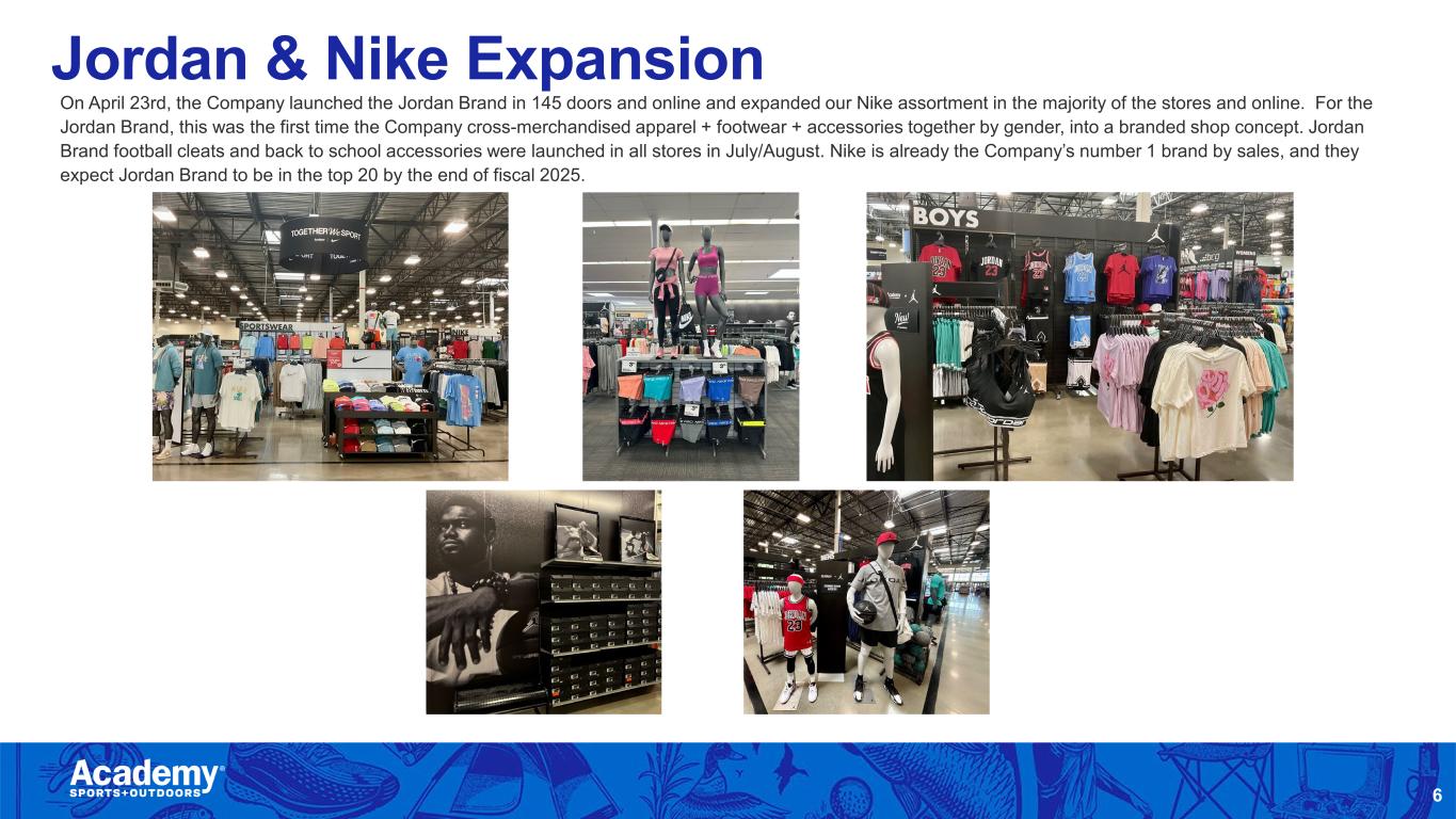 Jordan & Nike Expansion On April 23rd, the Company launched the Jordan Brand in 145 doors and online and expanded our Nike assortment in the majority of the stores and online. For the Jordan Brand, this was the first time the Company cross-merchandised apparel + footwear + accessories together by gender, into a branded shop concept. Jordan Brand football cleats and back to school accessories were launched in all stores in July/August. Nike is already the Company’s number 1 brand by sales, and they expect Jordan Brand to be in the top 20 by the end of fiscal 2025. 6
