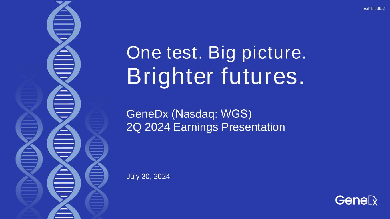 One test. Big picture. Brighter futures. July 30, 2024 GeneDx (Nasdaq: WGS)​ 2Q 2024 Earnings Presentation Exhibit 99.2