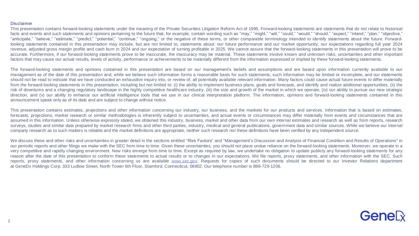 2 Disclaimer This presentation contains forward-looking statements under the meaning of the Private Securities Litigation Reform Act of 1995. Forward-looking statements are statements that do not relate to historical facts and events and such statements and opinions pertaining to the future that, for example, contain wording such as “may,” “might,” “will,” “could,” “would,” “should,” “expect,” “intend,” “plan,” “objective,” “anticipate,” “believe,” “estimate,” “predict,” “potential,” “continue,” “ongoing,” or the negative of these terms, or other comparable terminology intended to identify statements about the future. Forward- looking statements contained in this presentation may include, but are not limited to, statements about: our future performance and our market opportunity, our expectations regarding full year 2024 revenue, adjusted gross margin profile and cash burn in 2024 and our expectation of turning profitable in 2025. We cannot assure that the forward-looking statements in this presentation will prove to be accurate. Furthermore, if our forward-looking statements prove to be inaccurate, the inaccuracy may be material. These statements involve known and unknown risks, uncertainties and other important factors that may cause our actual results, levels of activity, performance or achievements to be materially different from the information expressed or implied by these forward-looking statements. The forward-looking statements and opinions contained in this presentation are based on our management’s beliefs and assumptions and are based upon information currently available to our management as of the date of this presentation and, while we believe such information forms a reasonable basis for such statements, such information may be limited or incomplete, and our statements should not be read to indicate that we have conducted an exhaustive inquiry into, or review of, all potentially available relevant information. Many factors could cause actual future events to differ materially from the forward-looking statements in this presentation, including but not limited to: (i) the ability to implement business plans, goals and forecasts, and identify and realize additional opportunities, (ii) the risk of downturns and a changing regulatory landscape in the highly competitive healthcare industry, (iii) the size and growth of the market in which we operate, (iv) our ability to pursue our new strategic direction, and (v) our ability to enhance our artificial intelligence tools that we use in our clinical interpretation platform. The information, opinions and forward-looking statements contained in this announcement speak only as of its date and are subject to change without notice. This presentation contains estimates, projections and other information concerning our industry, our business, and the markets for our products and services. Information that is based on estimates, forecasts, projections, market research or similar methodologies is inherently subject to uncertainties, and actual events or circumstances may differ materially from events and circumstances that are assumed in this information. Unless otherwise expressly stated, we obtained this industry, business, market and other data from our own internal estimates and research as well as from reports, research surveys, studies and similar data prepared by market research firms and other third parties, industry, medical and general publications, government data and similar sources. While we believe our internal company research as to such matters is reliable and the market definitions are appropriate, neither such research nor these definitions have been verified by any independent source. We discuss these and other risks and uncertainties in greater detail in the sections entitled “Risk Factors” and "Management's Discussion and Analysis of Financial Condition and Results of Operations" in our periodic reports and other filings we make with the SEC from time to time. Given these uncertainties, you should not place undue reliance on the forward-looking statements. Moreover, we operate in a very competitive and rapidly changing environment. New risks emerge from time to time. Except as required by law, we undertake no obligation to update publicly any forward-looking statements for any reason after the date of this presentation to conform these statements to actual results or to changes in our expectations. We file reports, proxy statements, and other information with the SEC. Such reports, proxy statements, and other information concerning us are available www.sec.gov. Requests for copies of such documents should be directed to our Investor Relations department at GeneDx Holdings Corp. 333 Ludlow Street, North Tower 6th Floor, Stamford, Connecticut, 06902. Our telephone number is 888-729-1206.