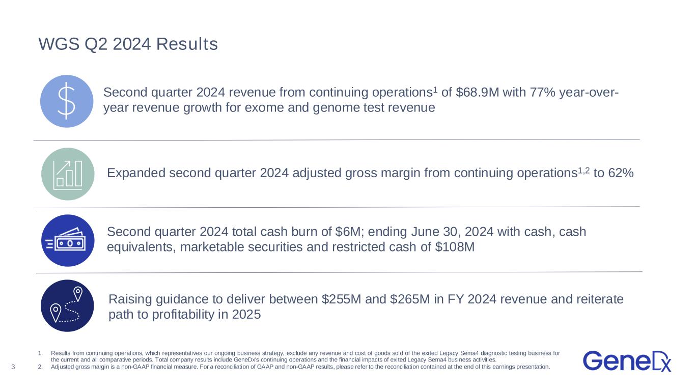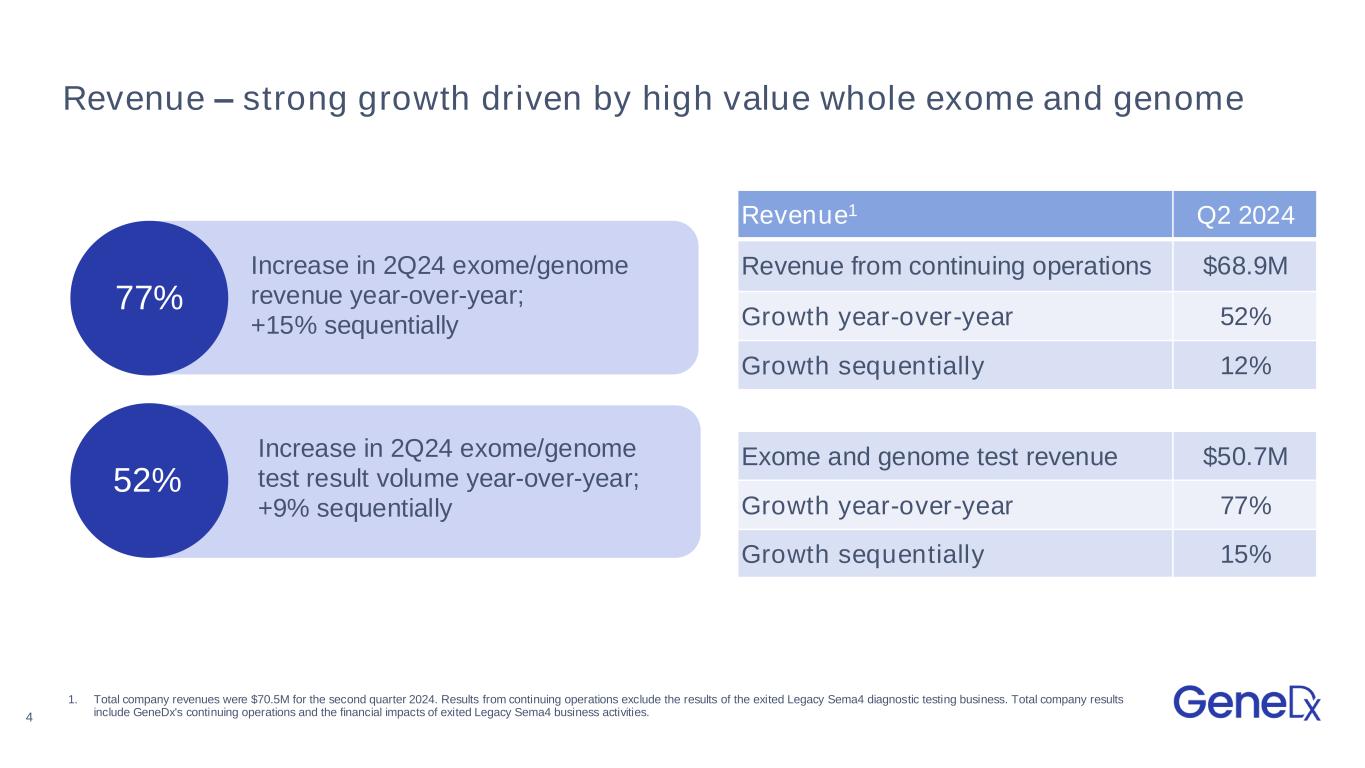 WGS Q2 2024 Results Second quarter 2024 revenue from continuing operations1 of $68.9M with 77% year-over- year revenue growth for exome and genome test revenue Raising guidance to deliver between $255M and $265M in FY 2024 revenue and reiterate path to profitability in 2025 Expanded second quarter 2024 adjusted gross margin from continuing operations1,2 to 62% Second quarter 2024 total cash burn of $6M; ending June 30, 2024 with cash, cash equivalents, marketable securities and restricted cash of $108M 1. Results from continuing operations, which representatives our ongoing business strategy, exclude any revenue and cost of goods sold of the exited Legacy Sema4 diagnostic testing business for the current and all comparative periods. Total company results include GeneDx's continuing operations and the financial impacts of exited Legacy Sema4 business activities. 2. Adjusted gross margin is a non-GAAP financial measure. For a reconciliation of GAAP and non-GAAP results, please refer to the reconciliation contained at the end of this earnings presentation.3