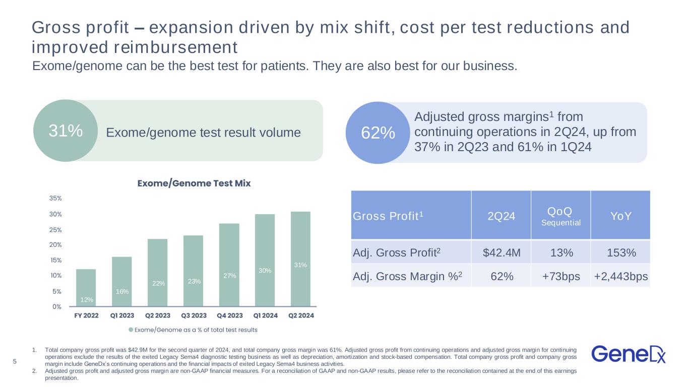 4 77% Revenue – strong growth driven by high value whole exome and genome Revenue1 Q2 2024 Revenue from continuing operations $68.9M Growth year-over-year 52% Growth sequentially 12% Exome and genome test revenue $50.7M Growth year-over-year 77% Growth sequentially 15% Increase in 2Q24 exome/genome test result volume year-over-year; +9% sequentially 1. Total company revenues were $70.5M for the second quarter 2024. Results from continuing operations exclude the results of the exited Legacy Sema4 diagnostic testing business. Total company results include GeneDx's continuing operations and the financial impacts of exited Legacy Sema4 business activities. 52% Increase in 2Q24 exome/genome revenue year-over-year; +15% sequentially