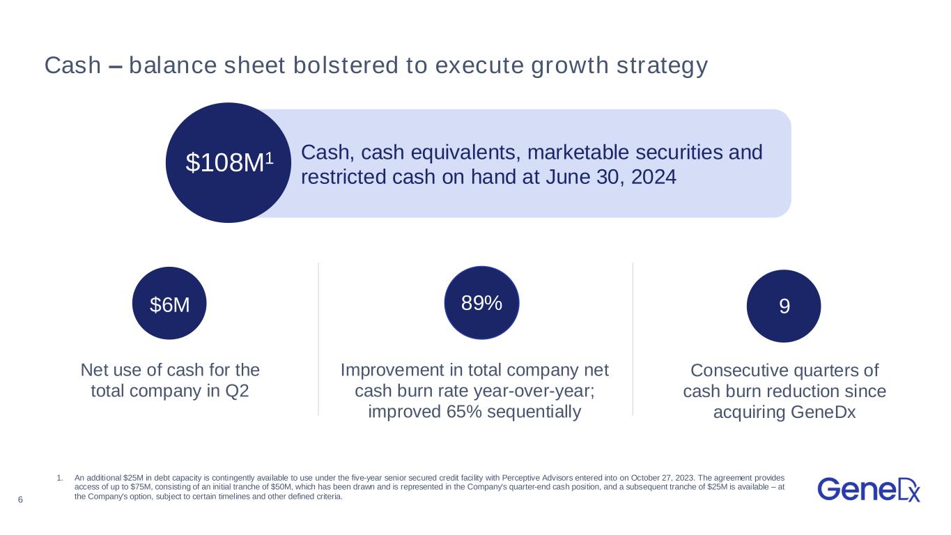 5 Gross profit – expansion driven by mix shift, cost per test reductions and improved reimbursement Exome/genome can be the best test for patients. They are also best for our business. 31% Exome/genome test result volume Adjusted gross margins1 from continuing operations in 2Q24, up from 37% in 2Q23 and 61% in 1Q24 62% 12% 16% 22% 23% 27% 30% 1. Total company gross profit was $42.9M for the second quarter of 2024, and total company gross margin was 61%. Adjusted gross profit from continuing operations and adjusted gross margin for continuing operations exclude the results of the exited Legacy Sema4 diagnostic testing business as well as depreciation, amortization and stock-based compensation. Total company gross profit and company gross margin include GeneDx’s continuing operations and the financial impacts of exited Legacy Sema4 business activities. 2. Adjusted gross profit and adjusted gross margin are non-GAAP financial measures. For a reconciliation of GAAP and non-GAAP results, please refer to the reconciliation contained at the end of this earnings presentation. Gross Profit1 2Q24 QoQ Sequential YoY Adj. Gross Profit2 $42.4M 13% 153% Adj. Gross Margin %2 62% +73bps +2,443bps 31%