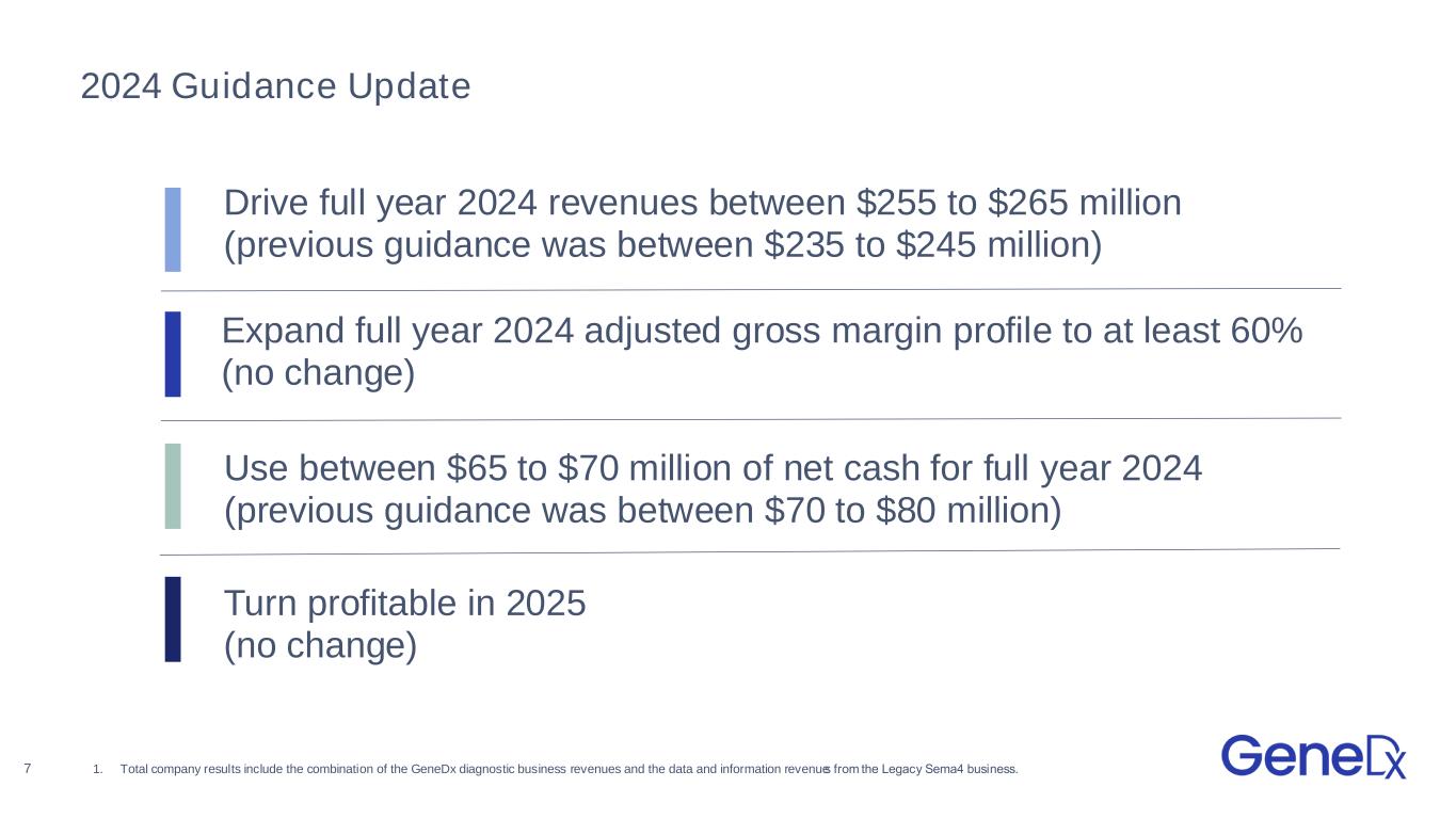 6 Cash – balance sheet bolstered to execute growth strategy 1 $108M1 Cash, cash equivalents, marketable securities and restricted cash on hand at June 30, 2024 9 Consecutive quarters of cash burn reduction since acquiring GeneDx Net use of cash for the total company in Q2 Improvement in total company net cash burn rate year-over-year; improved 65% sequentially $6M 89% 1. An additional $25M in debt capacity is contingently available to use under the five-year senior secured credit facility with Perceptive Advisors entered into on October 27, 2023. The agreement provides access of up to $75M, consisting of an initial tranche of $50M, which has been drawn and is represented in the Company's quarter-end cash position, and a subsequent tranche of $25M is available – at the Company's option, subject to certain timelines and other defined criteria.