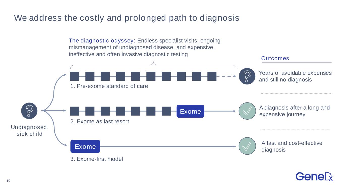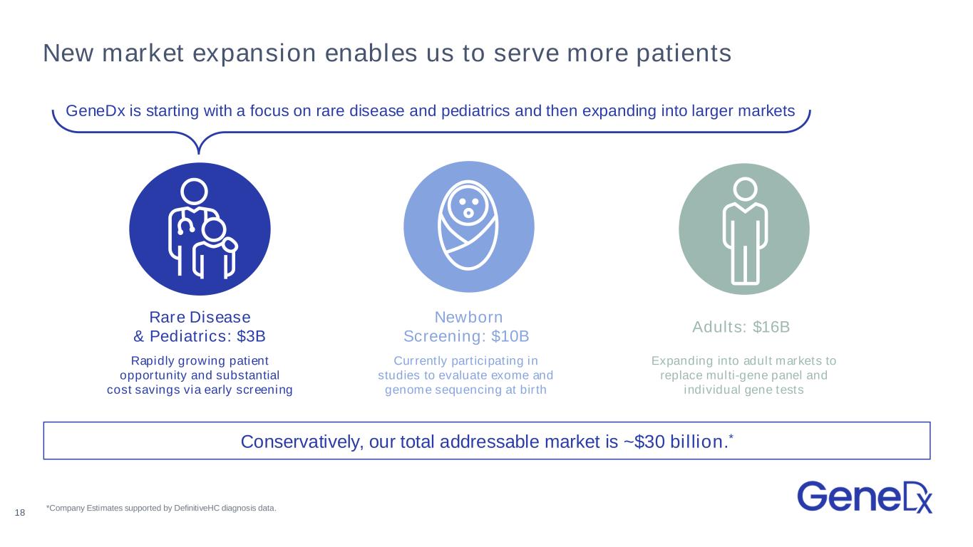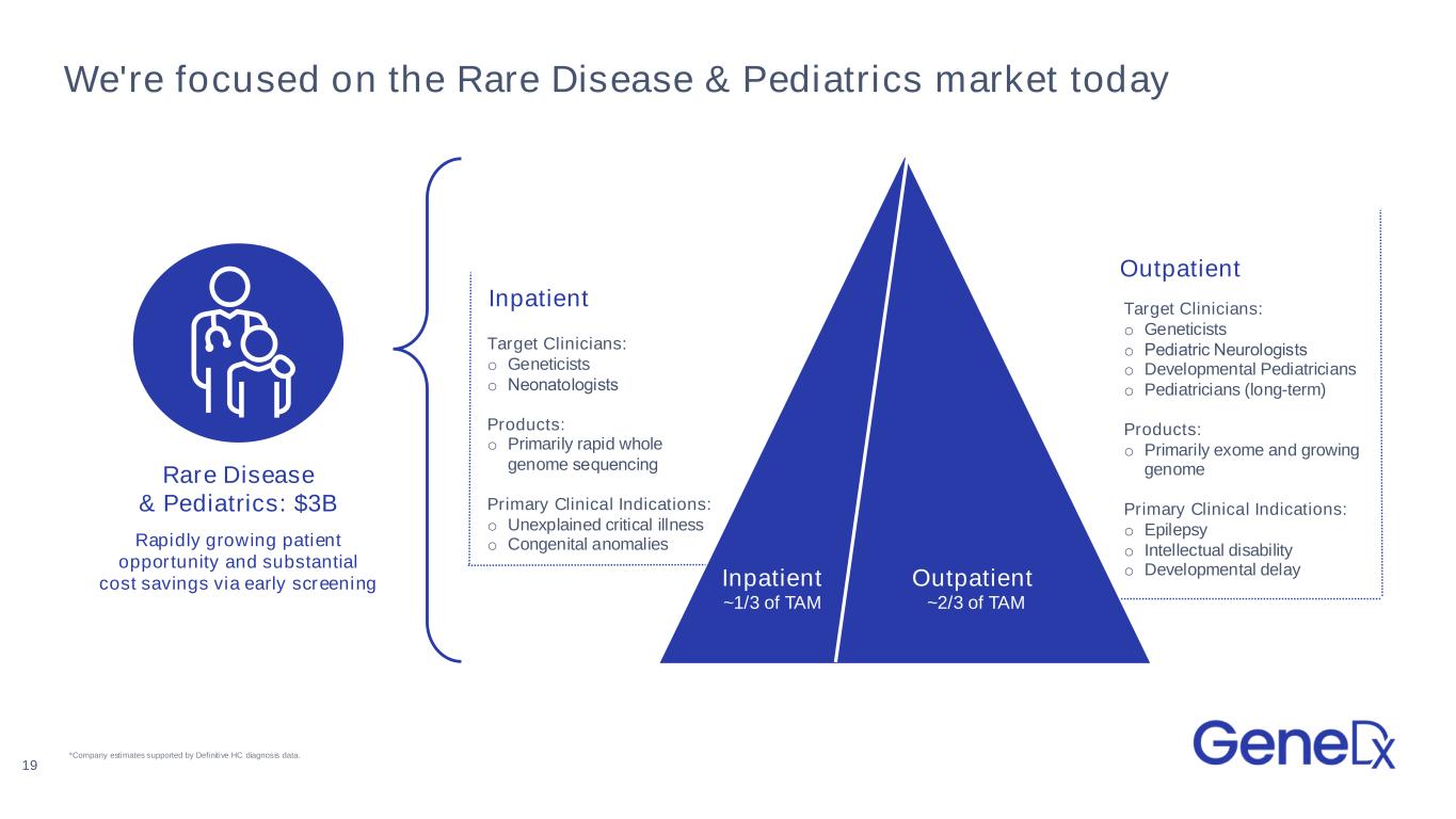 We're focused on the Rare Disease & Pediatrics market today Rapidly growing patient opportunity and substantial cost savings via early screening Rare Disease & Pediatrics: $3B 19 Inpatient ~1/3 of TAM Outpatient ~2/3 of TAM Target Clinicians: o Geneticists o Pediatric Neurologists​ o Developmental Pediatricians o Pediatricians (long-term) Products: o Primarily exome and growing genome Primary Clinical Indications: o Epilepsy o Intellectual disability o Developmental delay Target Clinicians: o Geneticists o Neonatologists​ Products: o Primarily rapid whole genome sequencing​ Primary Clinical Indications: o Unexplained critical illness o Congenital anomalies Inpatient Outpatient *Company estimates supported by Definitive HC diagnosis data.