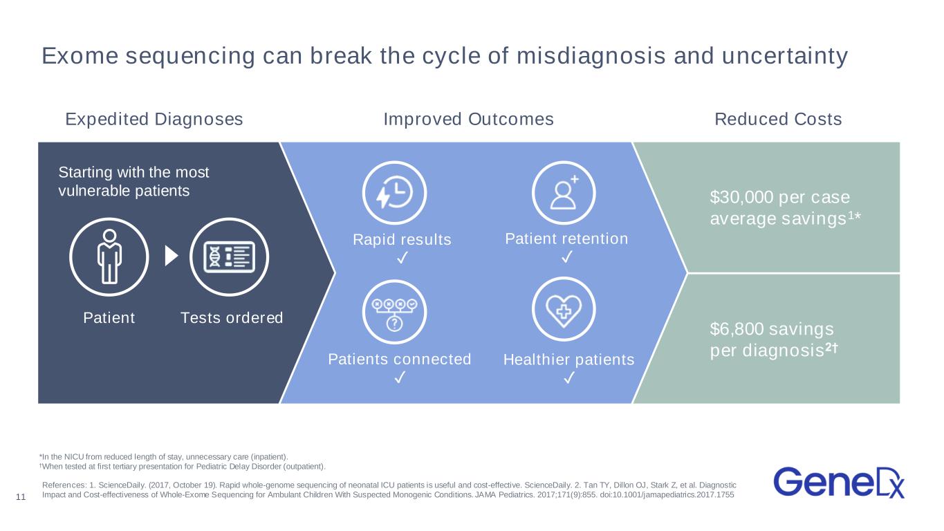 10 We address the costly and prolonged path to diagnosis Years of avoidable expenses and still no diagnosis A diagnosis after a long and expensive journey A fast and cost-effective diagnosis 1. Pre-exome standard of care 2. Exome as last resort 3. Exome-first model The diagnostic odyssey: Endless specialist visits, ongoing mismanagement of undiagnosed disease, and expensive, ineffective and often invasive diagnostic testing Undiagnosed, sick child Outcomes Exome Exome