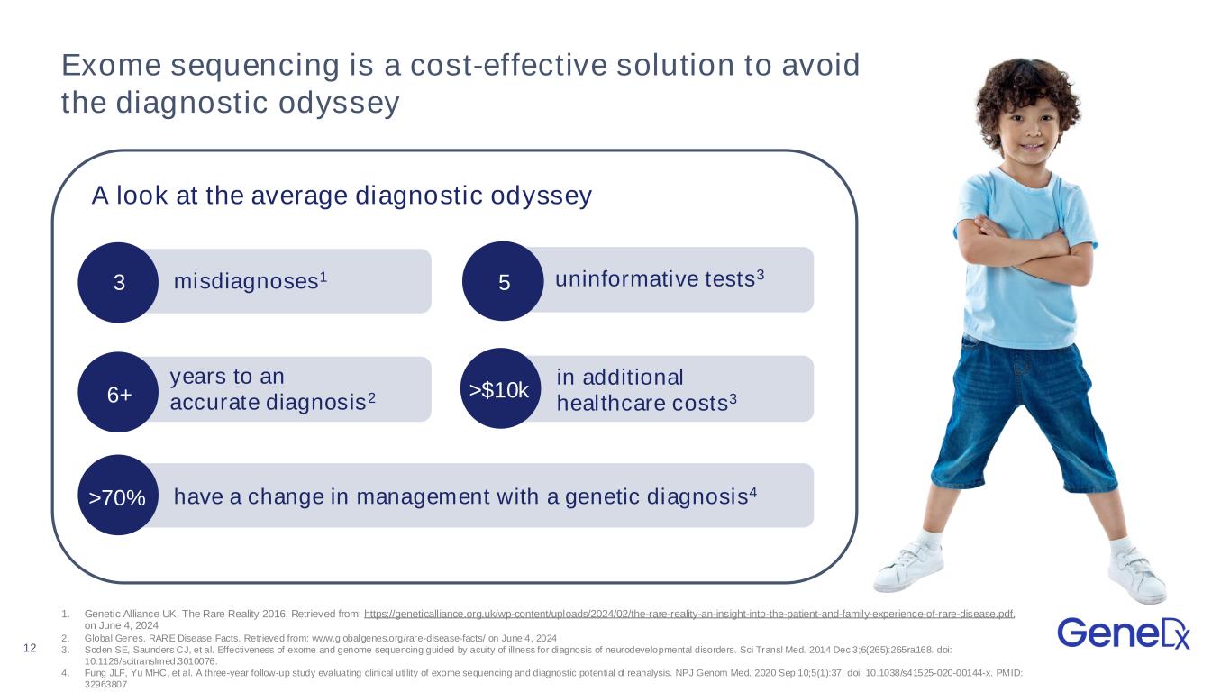 Exome sequencing can break the cycle of misdiagnosis and uncertainty $6,800 savings per diagnosis2† $30,000 per case average savings1* Rapid results ✓ Patient retention ✓ Patients connected ✓ Healthier patients ✓ Tests ordered Starting with the most vulnerable patients References: 1. ScienceDaily. (2017, October 19). Rapid whole-genome sequencing of neonatal ICU patients is useful and cost-effective. ScienceDaily. 2. Tan TY, Dillon OJ, Stark Z, et al. Diagnostic Impact and Cost-effectiveness of Whole-Exome Sequencing for Ambulant Children With Suspected Monogenic Conditions. JAMA Pediatrics. 2017;171(9):855. doi:10.1001/jamapediatrics.2017.1755 *In the NICU from reduced length of stay, unnecessary care (inpatient). †When tested at first tertiary presentation for Pediatric Delay Disorder (outpatient). 11 Patient Expedited Diagnoses Improved Outcomes Reduced Costs