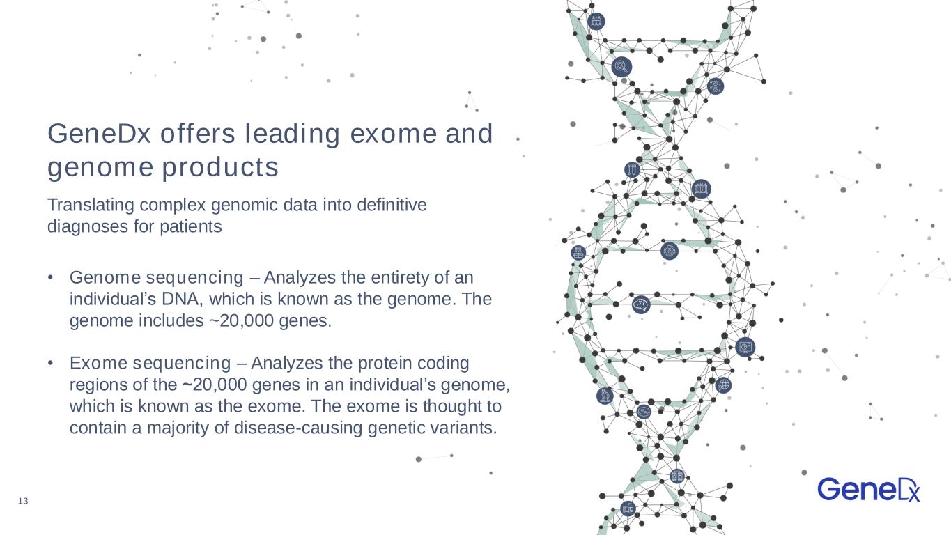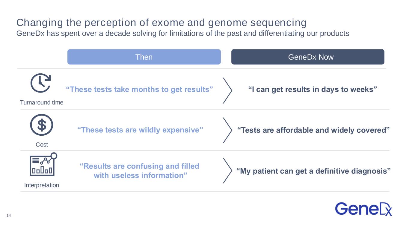 13 GeneDx offers leading exome and genome products • Genome sequencing – Analyzes the entirety of an individual’s DNA, which is known as the genome. The genome includes ~20,000 genes. • Exome sequencing – Analyzes the protein coding regions of the ~20,000 genes in an individual’s genome, which is known as the exome. The exome is thought to contain a majority of disease-causing genetic variants. Translating complex genomic data into definitive diagnoses for patients