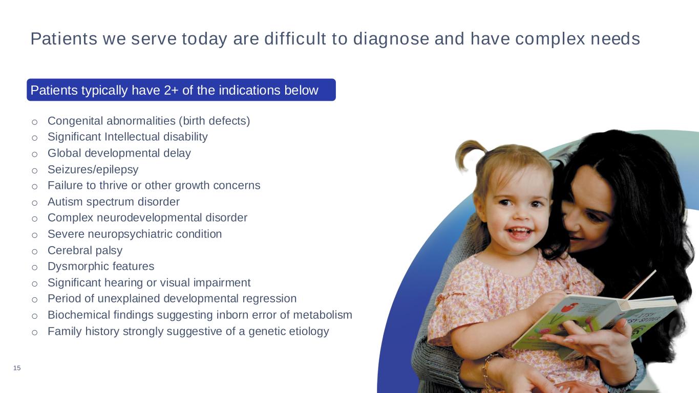 Changing the perception of exome and genome sequencing GeneDx has spent over a decade solving for limitations of the past and differentiating our products Then GeneDx Now “I can get results in days to weeks”“These tests take months to get results” “These tests are wildly expensive” “Tests are affordable and widely covered” “Results are confusing and filled with useless information” “My patient can get a definitive diagnosis” Turnaround time Cost Interpretation 14