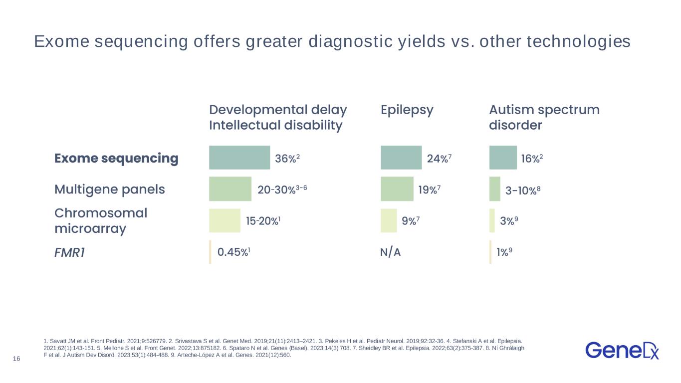15 Patients we serve today are difficult to diagnose and have complex needs o Congenital abnormalities (birth defects) o Significant Intellectual disability o Global developmental delay o Seizures/epilepsy o Failure to thrive or other growth concerns o Autism spectrum disorder o Complex neurodevelopmental disorder o Severe neuropsychiatric condition o Cerebral palsy o Dysmorphic features o Significant hearing or visual impairment o Period of unexplained developmental regression o Biochemical findings suggesting inborn error of metabolism o Family history strongly suggestive of a genetic etiology Patients typically have 2+ of the indications below