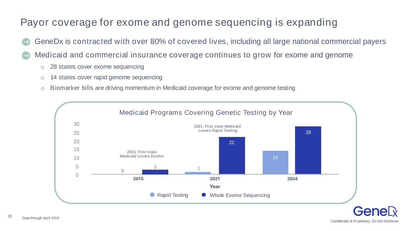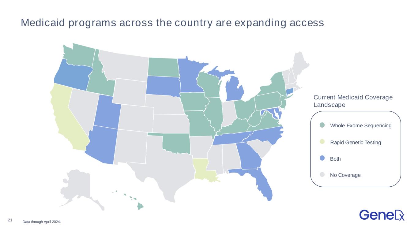 21 Medicaid programs across the country are expanding access Whole Exome Sequencing Rapid Genetic Testing Both No Coverage Current Medicaid Coverage Landscape Data through April 2024.