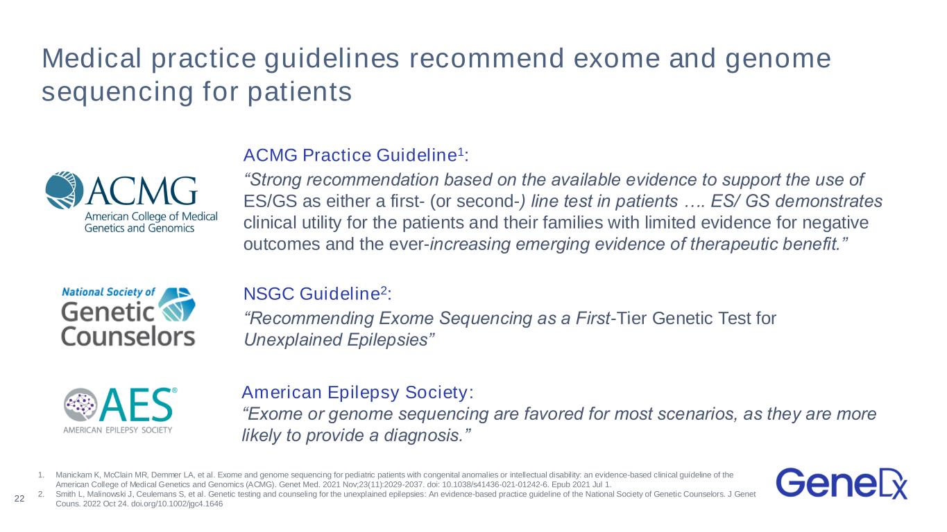 Medical practice guidelines recommend exome and genome sequencing for patients ACMG Practice Guideline1: “Strong recommendation based on the available evidence to support the use of ES/GS as either a first- (or second-) line test in patients …. ES/ GS demonstrates clinical utility for the patients and their families with limited evidence for negative outcomes and the ever-increasing emerging evidence of therapeutic benefit.” NSGC Guideline2: “Recommending Exome Sequencing as a First-Tier Genetic Test for Unexplained Epilepsies” 22 American Epilepsy Society: “Exome or genome sequencing are favored for most scenarios, as they are more likely to provide a diagnosis.” 1. Manickam K, McClain MR, Demmer LA, et al. Exome and genome sequencing for pediatric patients with congenital anomalies or intellectual disability: an evidence-based clinical guideline of the American College of Medical Genetics and Genomics (ACMG). Genet Med. 2021 Nov;23(11):2029-2037. doi: 10.1038/s41436-021-01242-6. Epub 2021 Jul 1. 2. Smith L, Malinowski J, Ceulemans S, et al. Genetic testing and counseling for the unexplained epilepsies: An evidence-based practice guideline of the National Society of Genetic Counselors. J Genet Couns. 2022 Oct 24. doi.org/10.1002/jgc4.1646