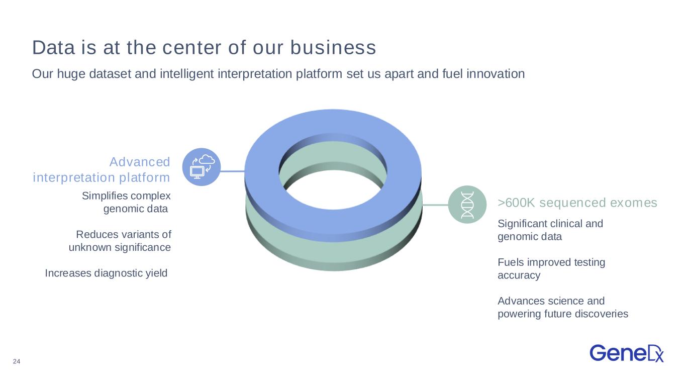 23 Pay-it-forward data strategy For every patient that we test, our underlying interpretation platform gets smarter, and we can offer more answers to more patients. The impact scales as we capture more and more of the market. Additional patients tested mproved interpretation platform ore underlying data ore answ ers for patients providers igher diagnostic y ield f ewer S Additional patients tested mproved interpretation platform ore underlying data ore answ ers for patients providers igher diagnostic yield fewer S