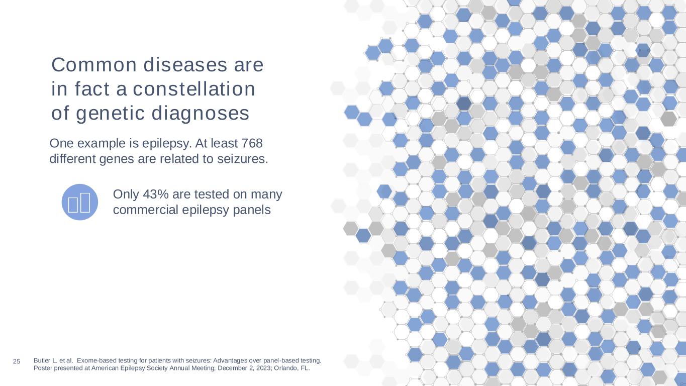 24 >600K sequenced exomes Data is at the center of our business Our huge dataset and intelligent interpretation platform set us apart and fuel innovation Simplifies complex genomic data Reduces variants of unknown significance Increases diagnostic yield Significant clinical and genomic data Fuels improved testing accuracy Advances science and powering future discoveries Advanced interpretation platform