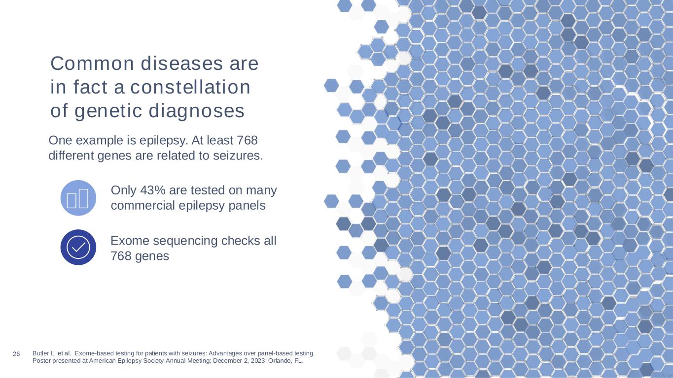 25 Butler L. et al. Exome-based testing for patients with seizures: Advantages over panel-based testing. Poster presented at American Epilepsy Society Annual Meeting; December 2, 2023; Orlando, FL. Only 43% are tested on many commercial epilepsy panels Common diseases are in fact a constellation of genetic diagnoses One example is epilepsy. At least 768 different genes are related to seizures.
