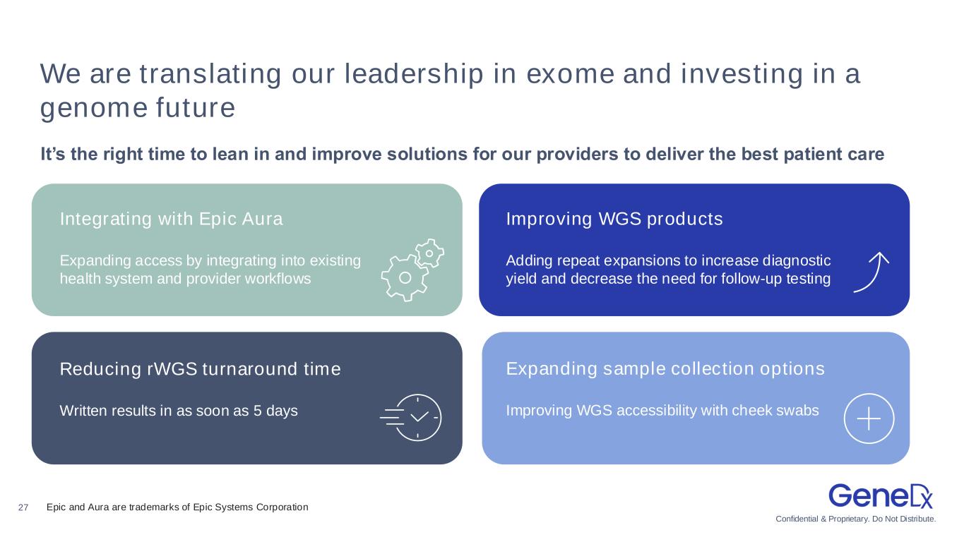 Confidential & Proprietary. Do Not Distribute. 27 We are translating our leadership in exome and investing in a genome future It’s the right time to lean in and improve solutions for our providers to deliver the best patient care Integrating with Epic Aura Expanding access by integrating into existing health system and provider workflows Improving WGS products Adding repeat expansions to increase diagnostic yield and decrease the need for follow-up testing Reducing rWGS turnaround time Written results in as soon as 5 days Expanding sample collection options Improving WGS accessibility with cheek swabs Epic and Aura are trademarks of Epic Systems Corporation