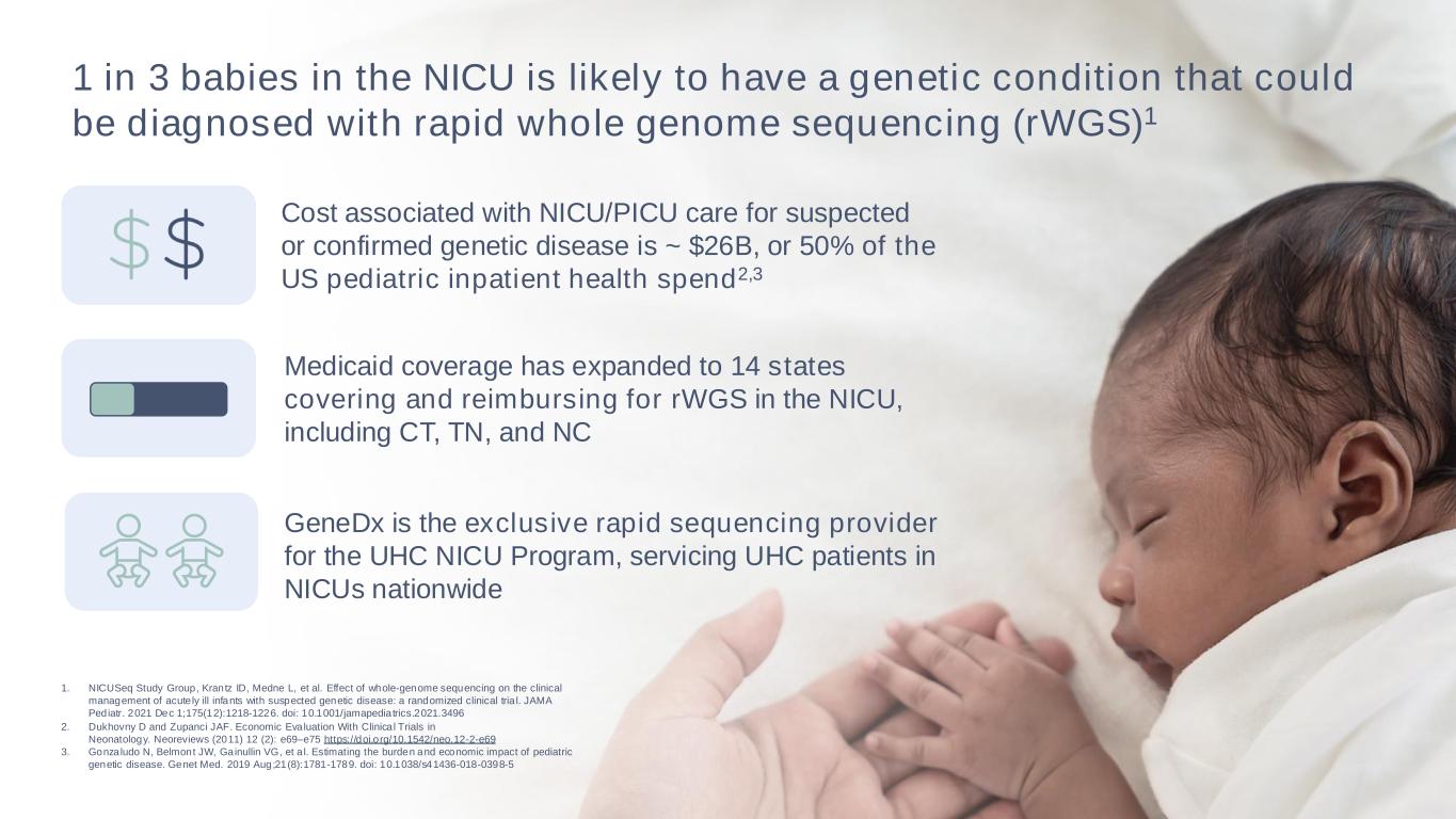 28 1 in 3 babies in the NICU is likely to have a genetic condition that could be diagnosed with rapid whole genome sequencing (rWGS)1 Cost associated with NICU/PICU care for suspected or confirmed genetic disease is ~ $26B, or 50% of the US pediatric inpatient health spend2,3 Medicaid coverage has expanded to 14 states covering and reimbursing for rWGS in the NICU, including CT, TN, and NC 1. NICUSeq Study Group, Krantz ID, Medne L, et al. Effect of whole-genome sequencing on the clinical management of acute ly ill infants with suspected genetic disease: a randomized clinical tria l. JAMA Pediatr. 2021 Dec 1;175(12):1218-1226. doi: 10.1001/jamapediatrics.2021.3496 2. Dukhovny D and Zupanci JAF. Economic Evaluation With Clinica l Trials in Neonatology. Neoreviews (2011) 12 (2): e69–e75 https://doi.org/10.1542/neo.12-2-e69 3. Gonzaludo N, Belmont JW, Gainullin VG, et a l. Estimating the burden and economic impact of pediatric genetic disease. Genet Med. 2019 Aug;21(8):1781-1789. doi: 10.1038/s41436-018-0398-5 GeneDx is the exclusive rapid sequencing provider for the UHC NICU Program, servicing UHC patients in NICUs nationwide