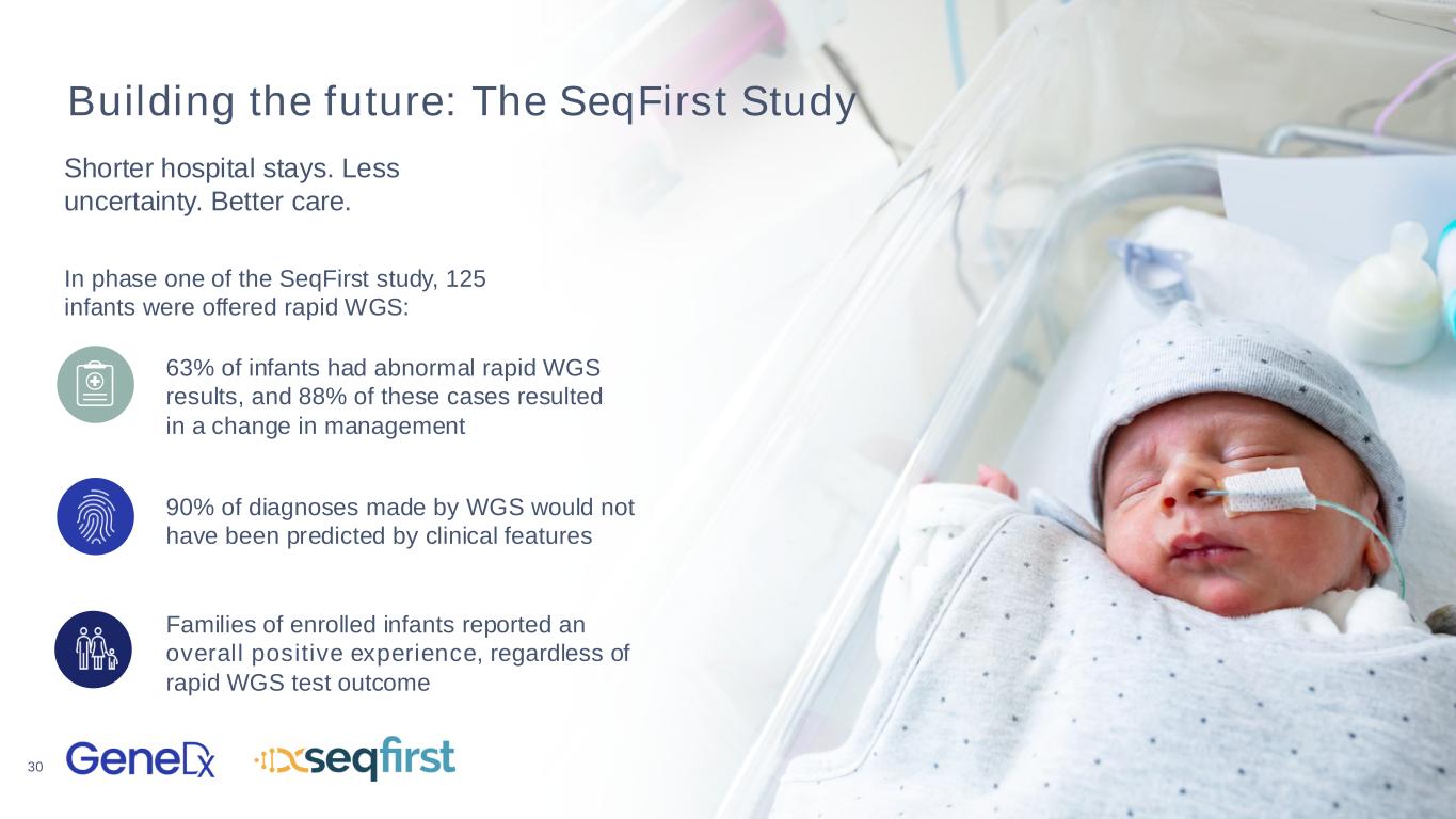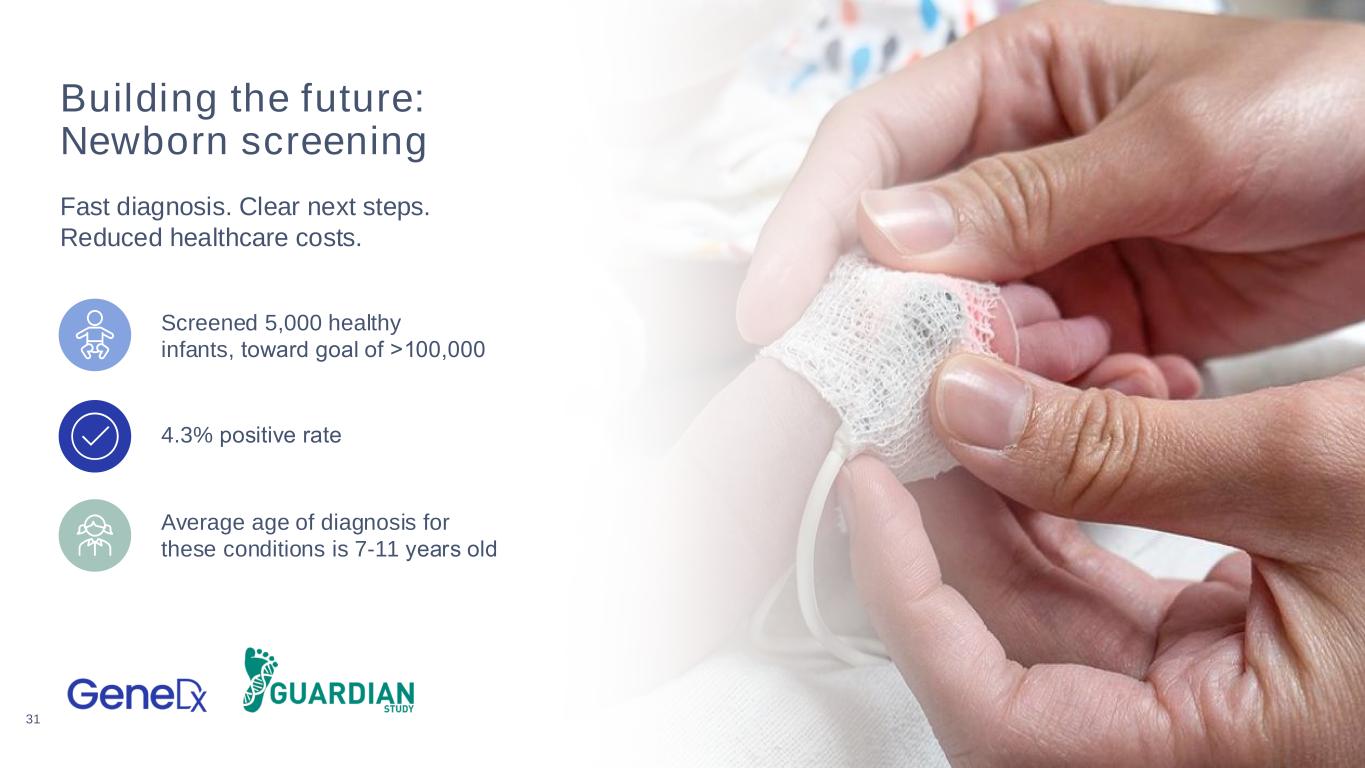 30 Building the future: The SeqFirst Study Shorter hospital stays. Less uncertainty. Better care. 63% of infants had abnormal rapid WGS results, and 88% of these cases resulted in a change in management In phase one of the SeqFirst study, 125 infants were offered rapid WGS: 90% of diagnoses made by WGS would not have been predicted by clinical features Families of enrolled infants reported an overall positive experience, regardless of rapid WGS test outcome