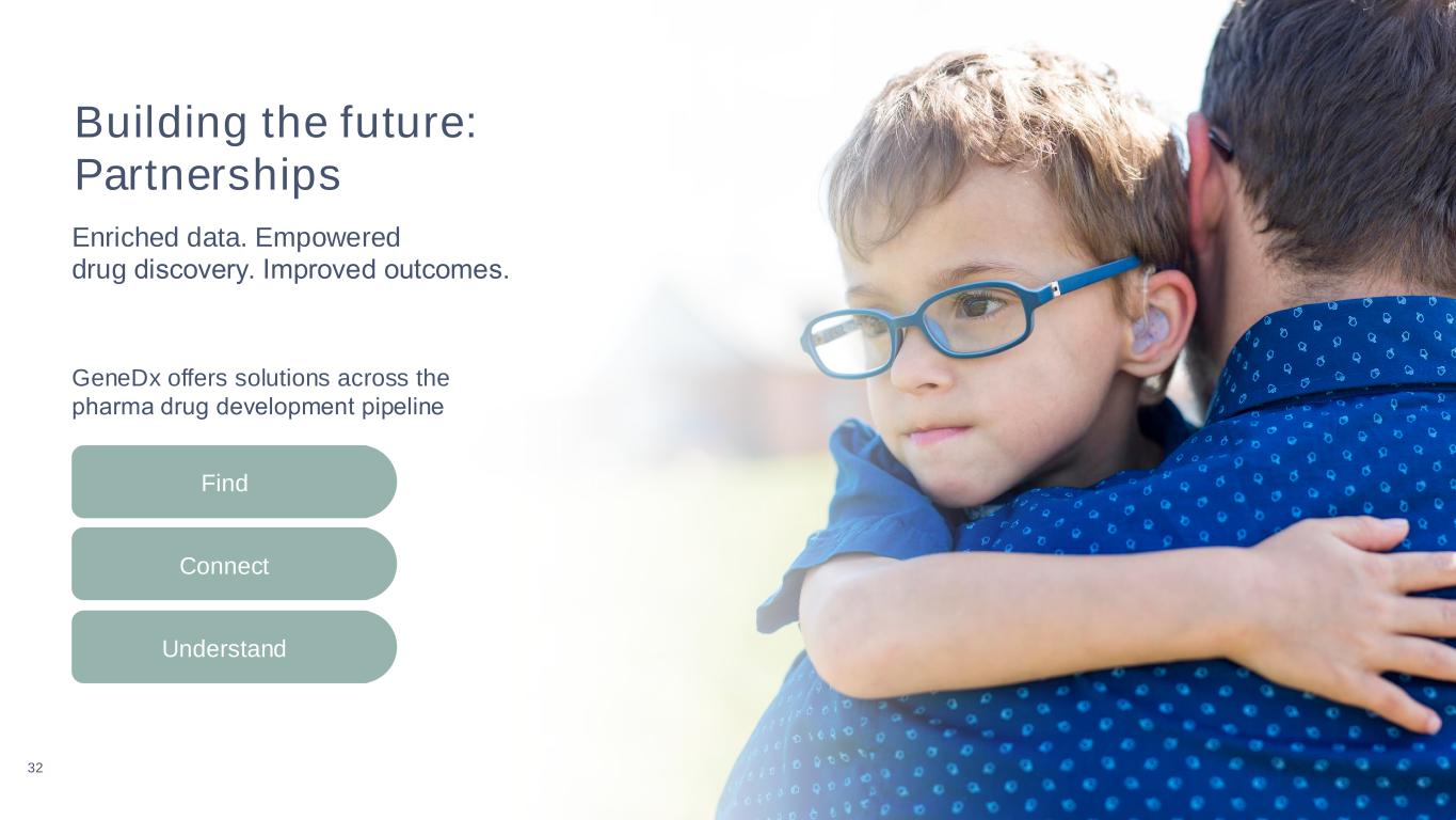 32 Building the future: Partnerships Enriched data. Empowered drug discovery. mproved outcomes.​ GeneDx offers solutions across the pharma drug development pipeline​ Find Connect Understand