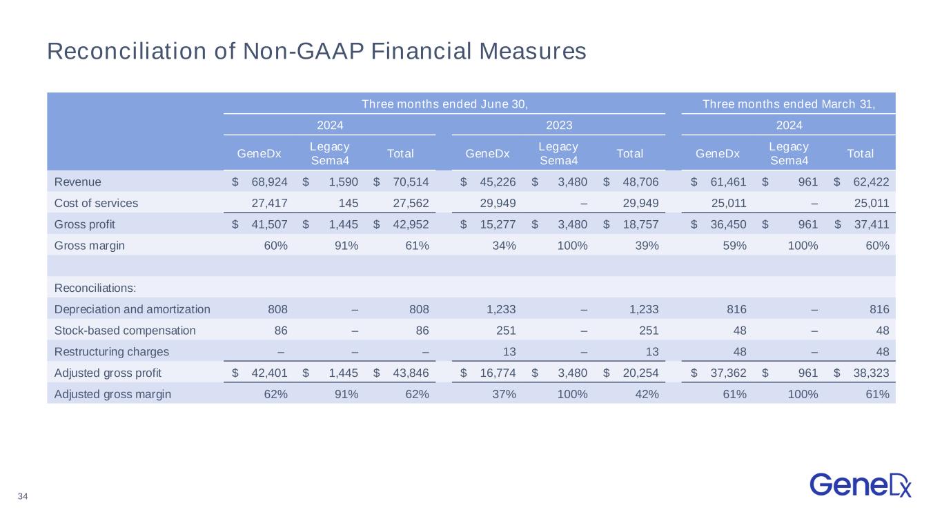 34 Reconciliation of Non-GAAP Financial Measures Three months ended June 30, Three months ended March 31, 2024 2023 2024 GeneDx Legacy Sema4 Total GeneDx Legacy Sema4 Total GeneDx Legacy Sema4 Total Revenue $ 68,924 $ 1,590 $ 70,514 $ 45,226 $ 3,480 $ 48,706 $ 61,461 $ 961 $ 62,422 Cost of services 27,417 145 27,562 29,949 – 29,949 25,011 – 25,011 Gross profit $ 41,507 $ 1,445 $ 42,952 $ 15,277 $ 3,480 $ 18,757 $ 36,450 $ 961 $ 37,411 Gross margin 60% 91% 61% 34% 100% 39% 59% 100% 60% Reconciliations: Depreciation and amortization 808 – 808 1,233 – 1,233 816 – 816 Stock-based compensation 86 – 86 251 – 251 48 – 48 Restructuring charges – – – 13 – 13 48 – 48 Adjusted gross profit $ 42,401 $ 1,445 $ 43,846 $ 16,774 $ 3,480 $ 20,254 $ 37,362 $ 961 $ 38,323 Adjusted gross margin 62% 91% 62% 37% 100% 42% 61% 100% 61%