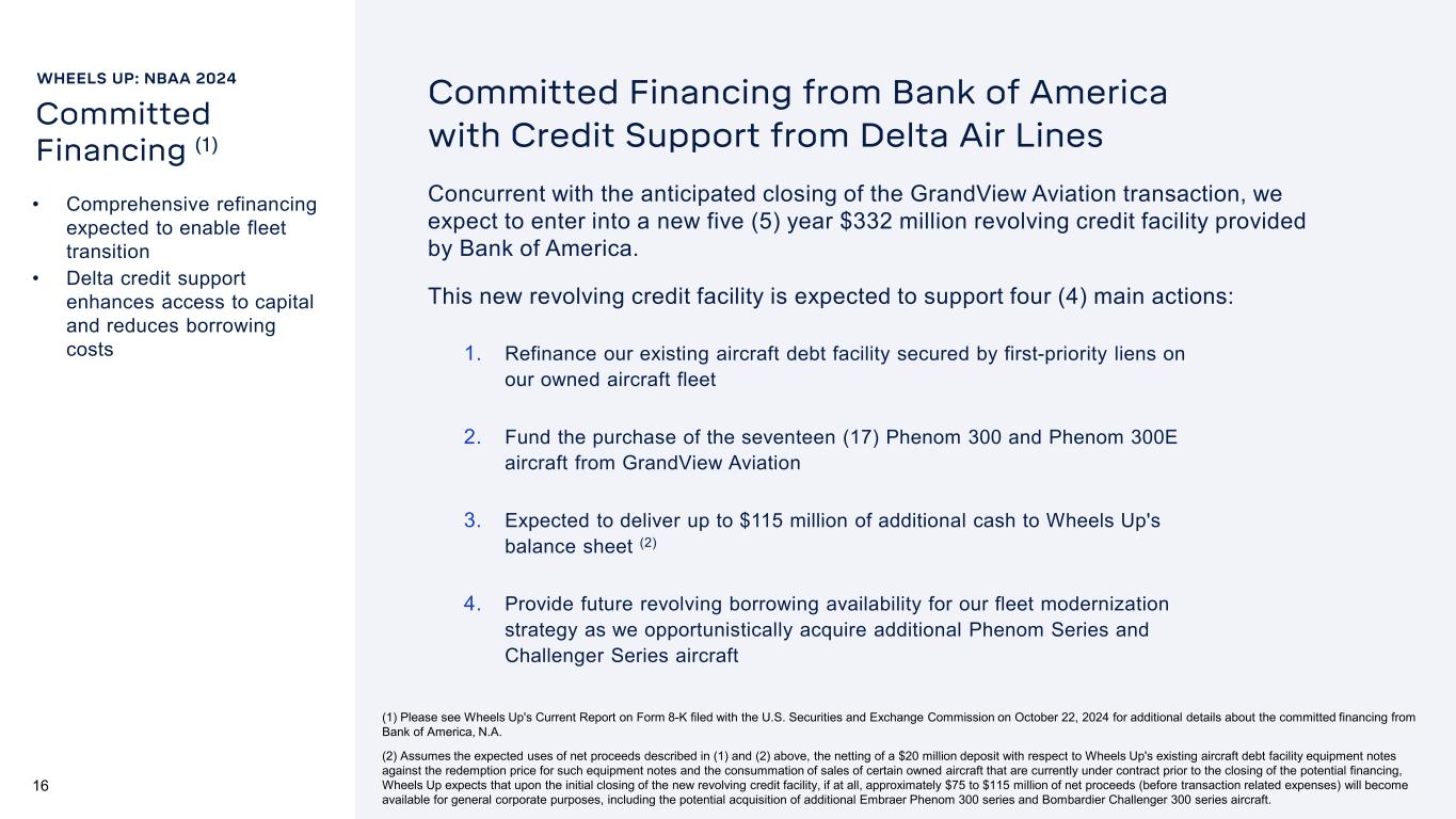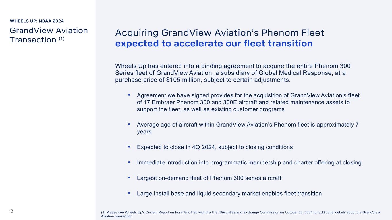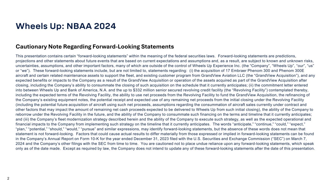 Cautionary Note Regarding Forward-Looking Statements This presentation contains certain “forward-looking statements” within the meaning of the federal securities laws. Forward-looking statements are predictions, projections and other statements about future events that are based on current expectations and assumptions and, as a result, are subject to known and unknown risks, uncertainties, assumptions, and other important factors, many of which are outside of the control of Wheels Up Experience Inc. (the “Company”, “Wheels Up”, “our”, “us” or “we”). These forward-looking statements include, but are not limited to, statements regarding: (i) the acquisition of 17 Embraer Phenom 300 and Phenom 300E aircraft and certain related maintenance assets to support the fleet, and existing customer program from GrandView Aviation LLC (the “GrandView Acquisition”), and any expected benefits or impacts to the Company as a result of the GrandView Acquisition or operation of the assets acquired as part of the GrandView Acquisition after closing, including the Company’s ability to consummate the closing of such acquisition on the schedule that it currently anticipates; (ii) the commitment letter entered into between Wheels Up and Bank of America, N.A. and the up to $332 million senior secured revolving credit facility (the “Revolving Facility”) contemplated thereby, including the expected terms of the Revolving Facility, the ability to use net proceeds from the Revolving Facility to fund the GrandView Acquisition, the refinancing of the Company’s existing equipment notes, the potential receipt and expected use of any remaining net proceeds from the initial closing under the Revolving Facility (including the potential future acquisition of aircraft using such net proceeds, assumptions regarding the consummation of aircraft sales currently under contract and other factors that may impact the amount of remaining net cash proceeds expected to be delivered to Wheels Up from such initial closing), the ability of the Company to reborrow under the Revolving Facility in the future, and the ability of the Company to consummate such financing on the terms and timeline that it currently anticipates; and (iii) the Company’s fleet modernization strategy described herein and the ability of the Company to execute such strategy, as well as the expected operational and financial impacts to the Company from implementing such strategy on the timeline that it currently anticipates. The words “anticipate,” “continue,” “could,” “expect,” “plan,” “potential,” “should,” “would,” “pursue” and similar expressions, may identify forward-looking statements, but the absence of these words does not mean that statement is not forward-looking. Factors that could cause actual results to differ materially from those expressed or implied in forward-looking statements can be found in the Company’s Annual Report on Form 10-K for the year ended December 31, 2023 filed with the U.S. Securities and Exchange Commission (“SEC”) on March 7, 2024 and the Company’s other filings with the SEC from time to time. You are cautioned not to place undue reliance upon any forward-looking statements, which speak only as of the date made. Except as required by law, the Company does not intend to update any of these forward-looking statements after the date of this presentation. Wheels Up: NBAA 2024 2