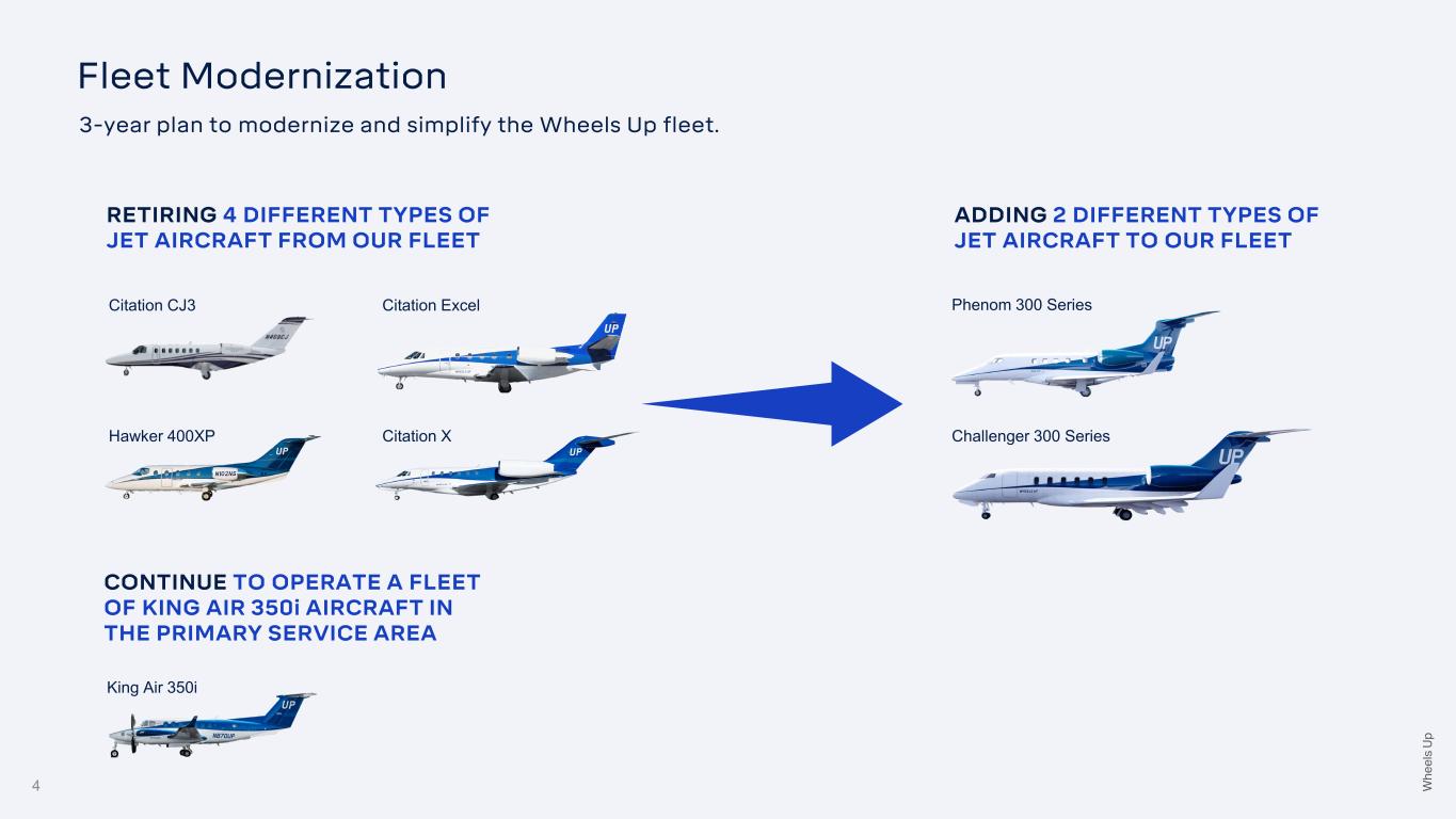 W he el s U p Fleet Modernization 3-year plan to modernize and simplify the Wheels Up fleet. CONTINUE TO OPERATE A FLEET OF KING AIR 350i AIRCRAFT IN THE PRIMARY SERVICE AREA King Air 350i 4 Phenom 300 Series Hawker 400XP Citation ExcelCitation CJ3 Citation X RETIRING 4 DIFFERENT TYPES OF JET AIRCRAFT FROM OUR FLEET ADDING 2 DIFFERENT TYPES OF JET AIRCRAFT TO OUR FLEET Challenger 300 Series