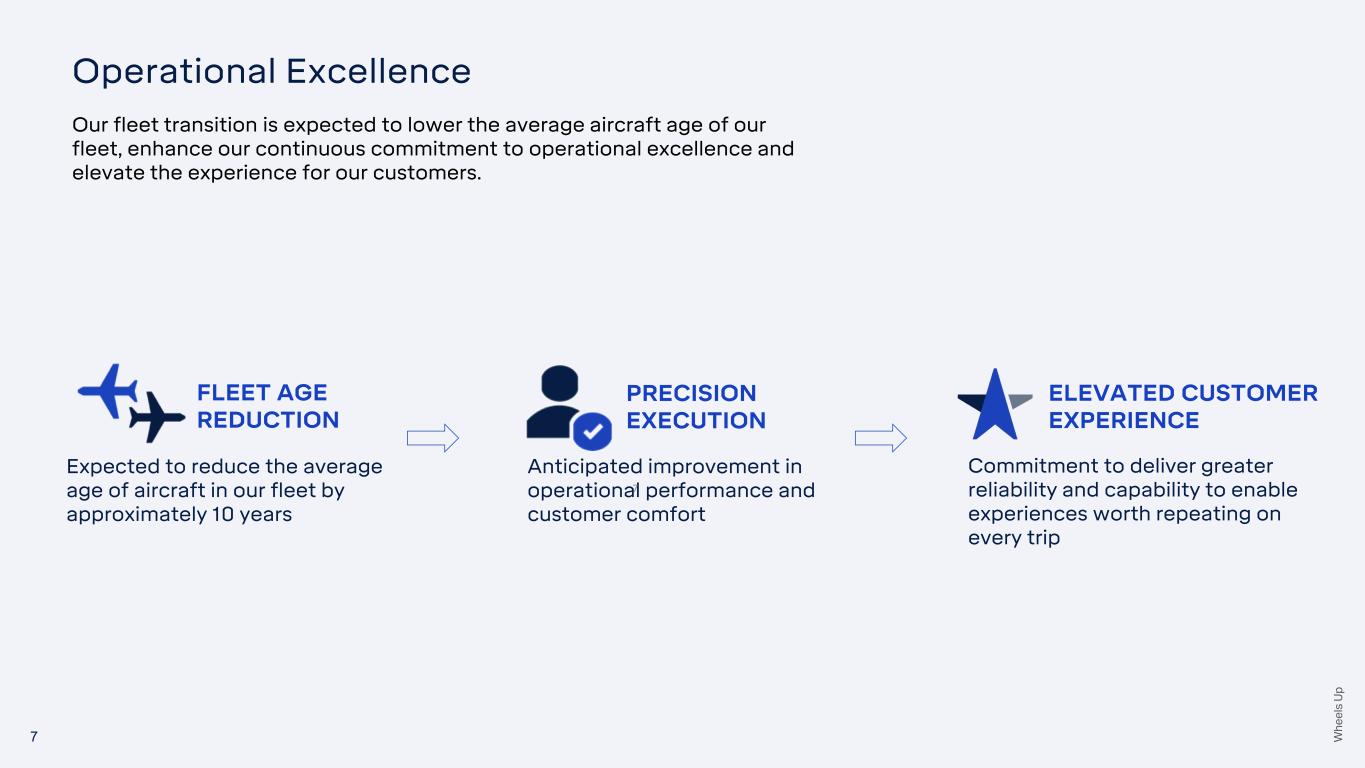 • Providing Wheels Up members and customers with more value through exclusive benefits not offered anywhere else in the aviation industry • Flexible, on-demand programmatic offering versus fractional alternative that comprises most of the install base of these aircraft types • Maximizing travel flexibility through seamless access to both private and premium commercial aviation for any trip, worldwide W he el s U p x D el ta A ir L in es Developing a first of its kind global aviation solution with Delta 6