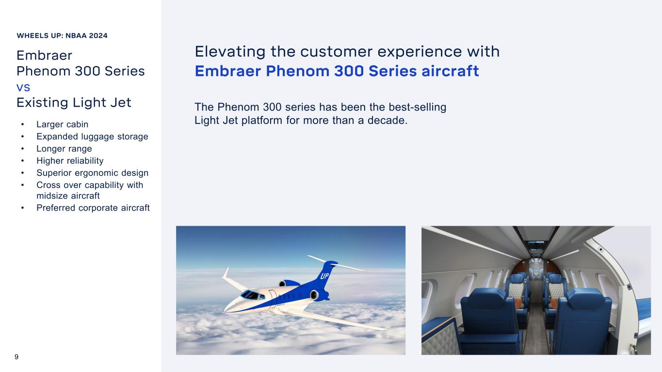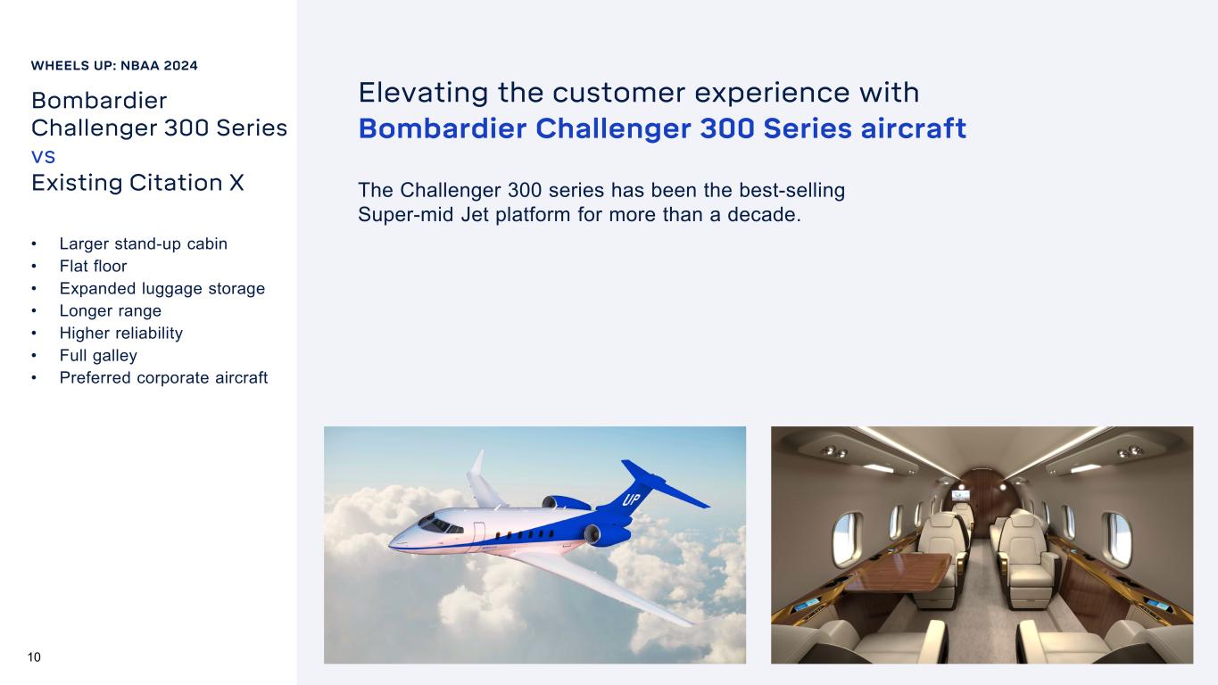 9 Confidential, Wheels Up Experience Inc. Embraer Phenom 300 Series vs Existing Light Jet Elevating the customer experience with Embraer Phenom 300 Series aircraft The Phenom 300 series has been the best-selling Light Jet platform for more than a decade. WHEELS UP: NBAA 2024 9 • Larger cabin • Expanded luggage storage • Longer range • Higher reliability • Superior ergonomic design • Cross over capability with midsize aircraft • Preferred corporate aircraft