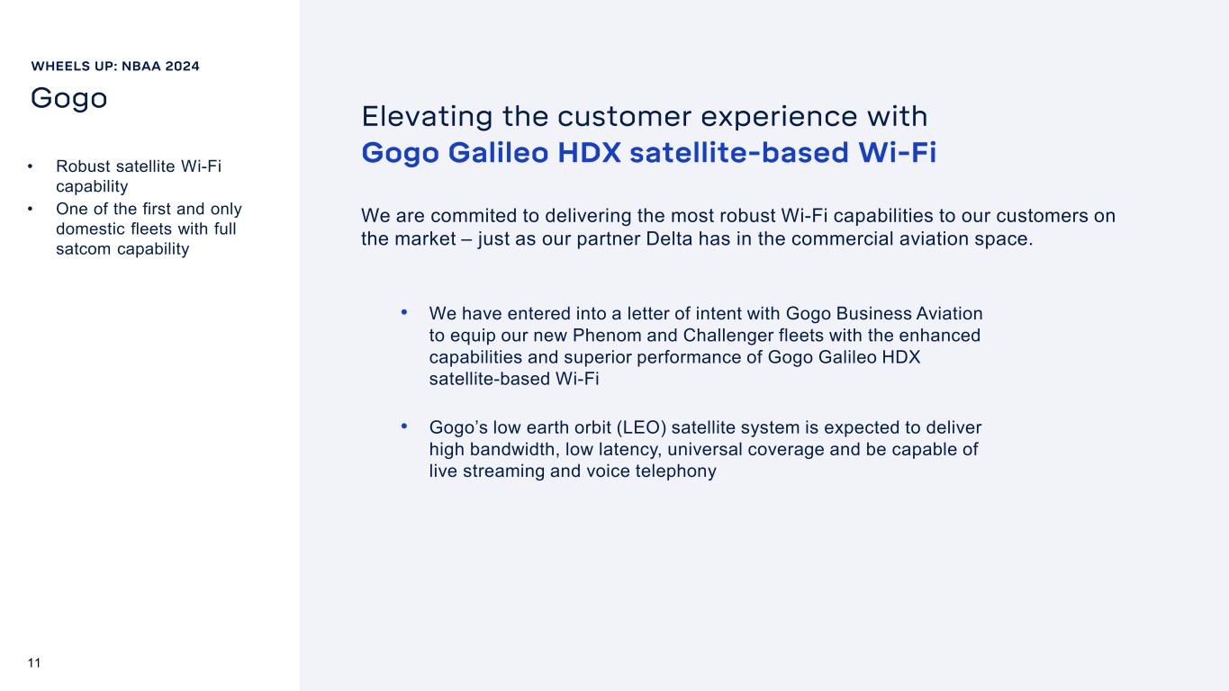 10 Confidential, Wheels Up Experience Inc. Elevating the customer experience with Bombardier Challenger 300 Series aircraft Bombardier Challenger 300 Series vs Existing Citation X WHEELS UP: NBAA 2024 10 • Larger stand-up cabin • Flat floor • Expanded luggage storage • Longer range • Higher reliability • Full galley • Preferred corporate aircraft The Challenger 300 series has been the best-selling Super-mid Jet platform for more than a decade.