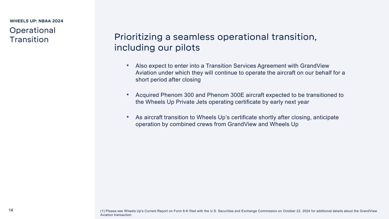 13 Confidential, Wheels Up Experience Inc. GrandView Aviation Transaction (1) Acquiring GrandView Aviation’s Phenom Fleet expected to accelerate our fleet transition Wheels Up has entered into a binding agreement to acquire the entire Phenom 300 Series fleet of GrandView Aviation, a subsidiary of Global Medical Response, at a purchase price of $105 million, subject to certain adjustments. WHEELS UP: NBAA 2024 (1) Please see Wheels Up's Current Report on Form 8-K filed with the U.S. Securities and Exchange Commission on October 22, 2024 for additional details about the GrandView Aviation transaction. 13 • Agreement we have signed provides for the acquisition of GrandView Aviation’s fleet of 17 Embraer Phenom 300 and 300E aircraft and related maintenance assets to support the fleet, as well as existing customer programs • Average age of aircraft within GrandView Aviation’s Phenom fleet is approximately 7 years • Expected to close in 4Q 2024, subject to closing conditions • Immediate introduction into programmatic membership and charter offering at closing • Largest on-demand fleet of Phenom 300 series aircraft • Large install base and liquid secondary market enables fleet transition