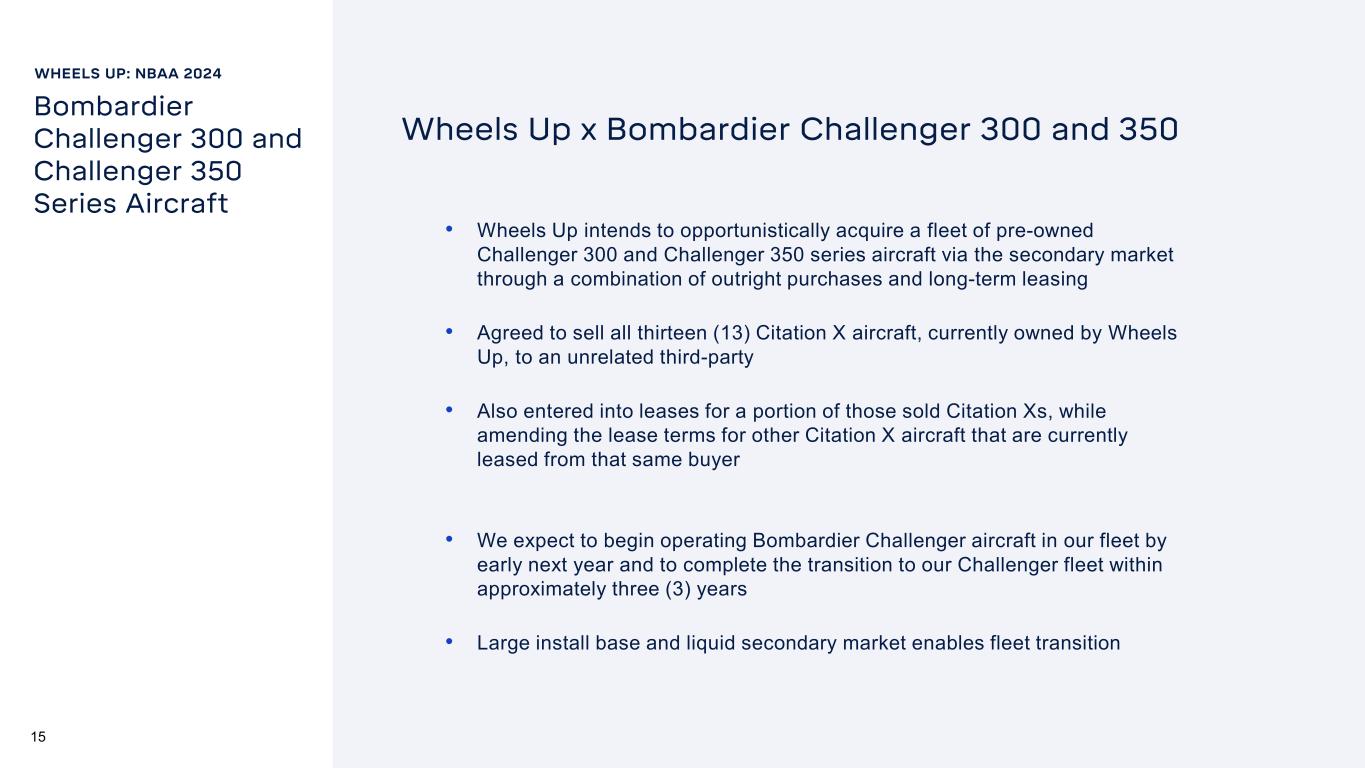 14 Confidential, Wheels Up Experience Inc. Operational Transition • Also expect to enter into a Transition Services Agreement with GrandView Aviation under which they will continue to operate the aircraft on our behalf for a short period after closing • Acquired Phenom 300 and Phenom 300E aircraft expected to be transitioned to the Wheels Up Private Jets operating certificate by early next year • As aircraft transition to Wheels Up’s certificate shortly after closing, anticipate operation by combined crews from GrandView and Wheels Up WHEELS UP: NBAA 2024 (1) Please see Wheels Up's Current Report on Form 8-K filed with the U.S. Securities and Exchange Commission on October 22, 2024 for additional details about the GrandView Aviation transaction. 14 Prioritizing a seamless operational transition, including our pilots