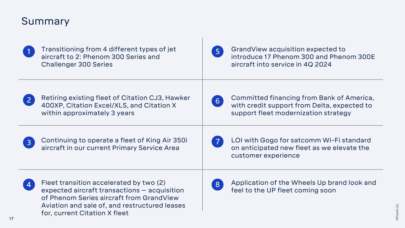 16 Confidential, Wheels Up Experience Inc. Committed Financing (1) Committed Financing from Bank of America with Credit Support from Delta Air Lines Concurrent with the anticipated closing of the GrandView Aviation transaction, we expect to enter into a new five (5) year $332 million revolving credit facility provided by Bank of America. This new revolving credit facility is expected to support four (4) main actions: 1. Refinance our existing aircraft debt facility secured by first-priority liens on our owned aircraft fleet 2. Fund the purchase of the seventeen (17) Phenom 300 and Phenom 300E aircraft from GrandView Aviation 3. Expected to deliver up to $115 million of additional cash to Wheels Up's balance sheet (2) 4. Provide future revolving borrowing availability for our fleet modernization strategy as we opportunistically acquire additional Phenom Series and Challenger Series aircraft WHEELS UP: NBAA 2024 (2) Assumes the expected uses of net proceeds described in (1) and (2) above, the netting of a $20 million deposit with respect to Wheels Up's existing aircraft debt facility equipment notes against the redemption price for such equipment notes and the consummation of sales of certain owned aircraft that are currently under contract prior to the closing of the potential financing, Wheels Up expects that upon the initial closing of the new revolving credit facility, if at all, approximately $75 to $115 million of net proceeds (before transaction related expenses) will become available for general corporate purposes, including the potential acquisition of additional Embraer Phenom 300 series and Bombardier Challenger 300 series aircraft. (1) Please see Wheels Up's Current Report on Form 8-K filed with the U.S. Securities and Exchange Commission on October 22, 2024 for additional details about the committed financing from Bank of America, N.A. 16 • Comprehensive refinancing expected to enable fleet transition • Delta credit support enhances access to capital and reduces borrowing costs