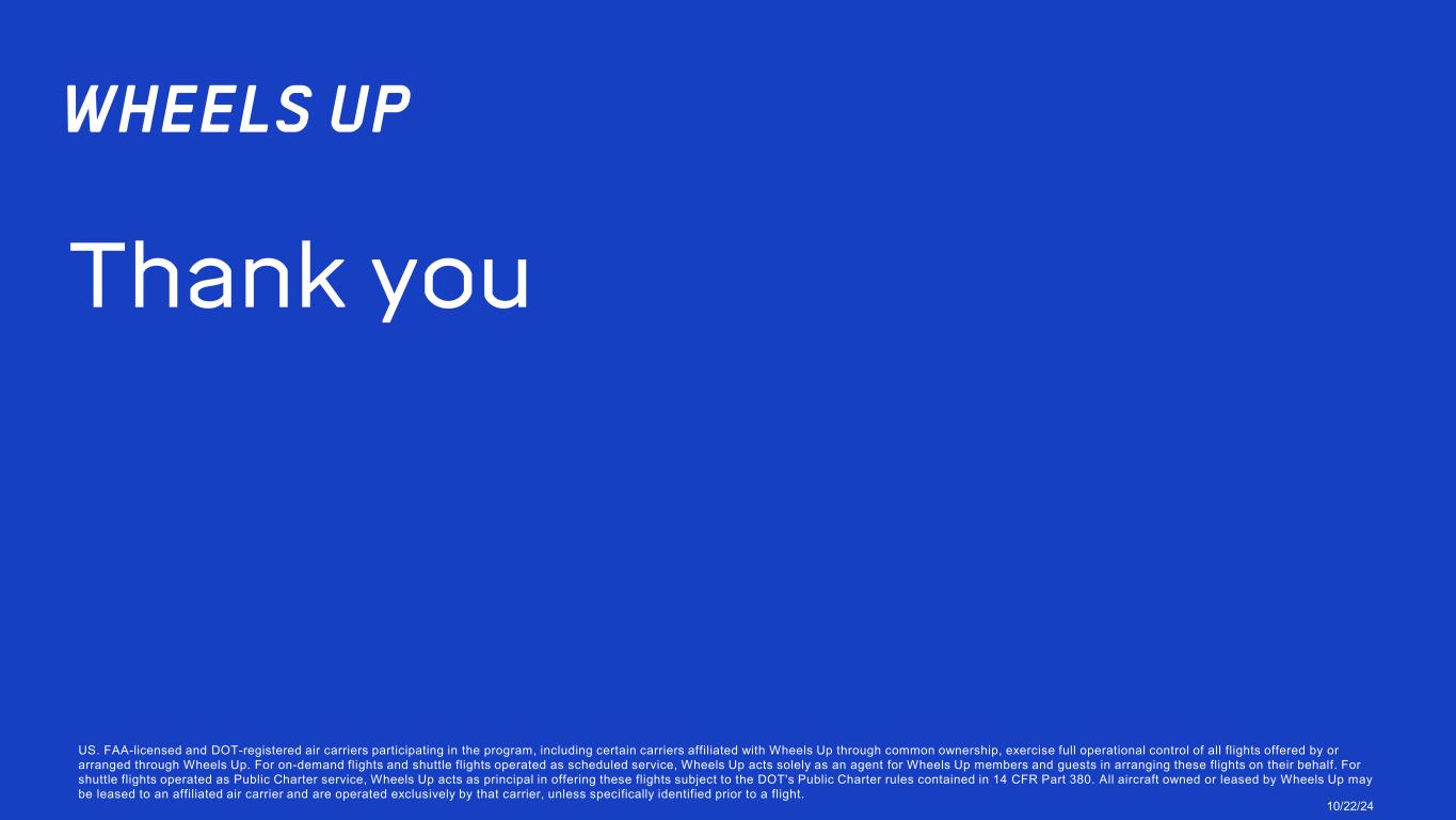 Confidential, Wheels Up Experience Inc. Thank you 10/22/24 US. FAA-licensed and DOT-registered air carriers participating in the program, including certain carriers affiliated with Wheels Up through common ownership, exercise full operational control of all flights offered by or arranged through Wheels Up. For on-demand flights and shuttle flights operated as scheduled service, Wheels Up acts solely as an agent for Wheels Up members and guests in arranging these flights on their behalf. For shuttle flights operated as Public Charter service, Wheels Up acts as principal in offering these flights subject to the DOT's Public Charter rules contained in 14 CFR Part 380. All aircraft owned or leased by Wheels Up may be leased to an affiliated air carrier and are operated exclusively by that carrier, unless specifically identified prior to a flight.