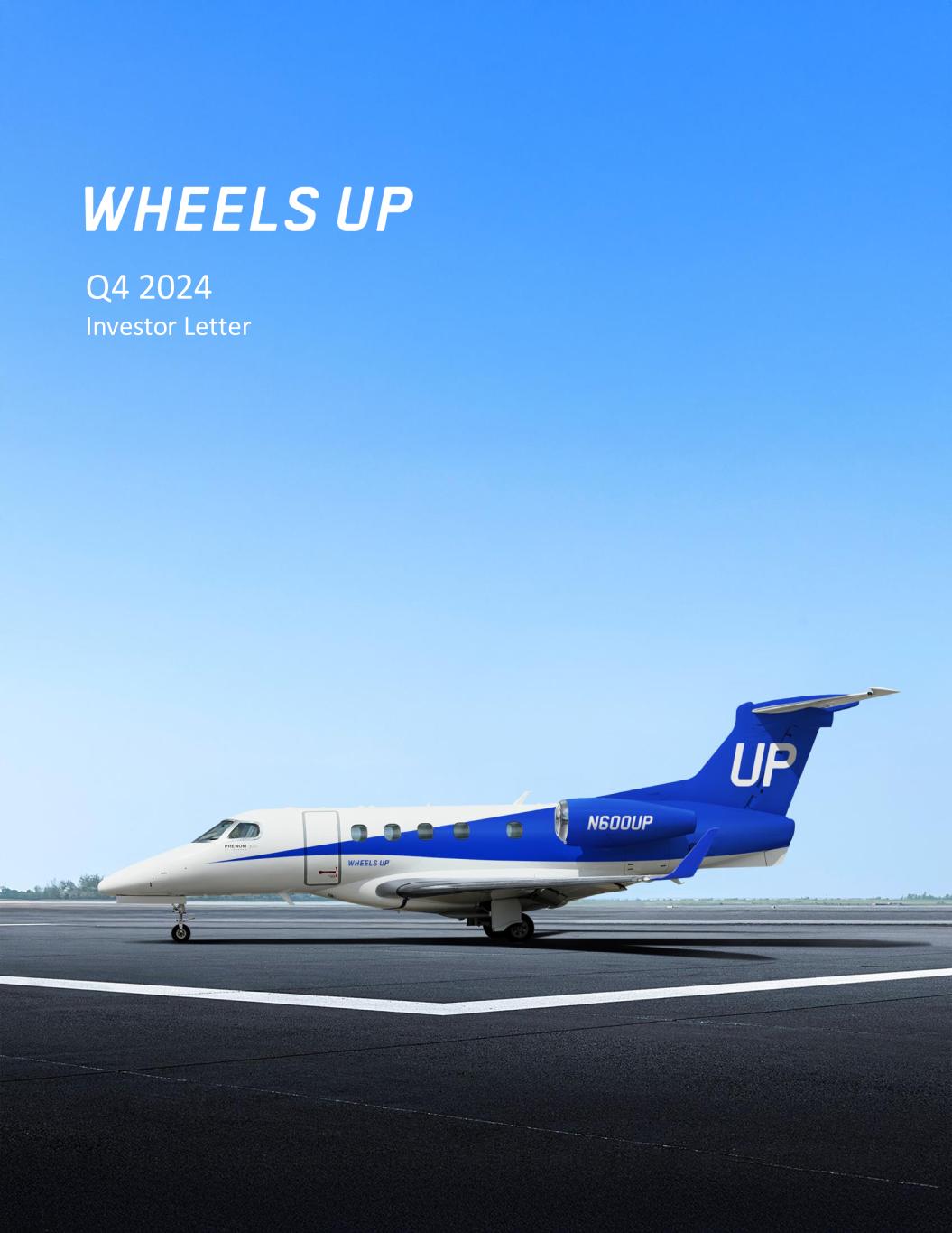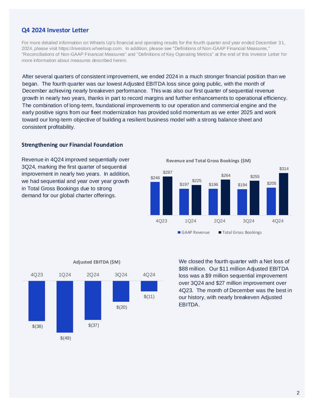 2 Q4 2024 Investor Letter For more detailed information on Wheels Up's financial and operating results for the fourth quarter and year ended December 31, 2024, please visit https://investors.wheelsup.com. In addition, please see "Definitions of Non-GAAP Financial Measures," "Reconciliations of Non-GAAP Financial Measures" and "Definitions of Key Operating Metrics" at the end of this Investor Letter for more information about measures described herein. Revenue in 4Q24 improved sequentially over 3Q24, marking the first quarter of sequential improvement in nearly two years. In addition, we had sequential and year over year growth in Total Gross Bookings due to strong demand for our global charter offerings. Strengthening our Financial Foundation We closed the fourth quarter with a Net loss of $88 million. Our $11 million Adjusted EBITDA loss was a $9 million sequential improvement over 3Q24 and $27 million improvement over 4Q23. The month of December was the best in our history, with nearly breakeven Adjusted EBITDA. $(38) $(49) $(37) $(20) $(11) 4Q23 1Q24 2Q24 3Q24 4Q24 Adjusted EBITDA ($M) After several quarters of consistent improvement, we ended 2024 in a much stronger financial position than we began. The fourth quarter was our lowest Adjusted EBITDA loss since going public, with the month of December achieving nearly breakeven performance. This was also our first quarter of sequential revenue growth in nearly two years, thanks in part to record margins and further enhancements to operational efficiency. The combination of long-term, foundational improvements to our operation and commercial engine and the early positive signs from our fleet modernization has provided solid momentum as we enter 2025 and work toward our long-term objective of building a resilient business model with a strong balance sheet and consistent profitability. $246 $197 $196 $194 $205 $287 $225 $264 $255 $314 4Q23 1Q24 2Q24 3Q24 4Q24 Revenue and Total Gross Bookings ($M) GAAP Revenue Total Gross Bookings 2