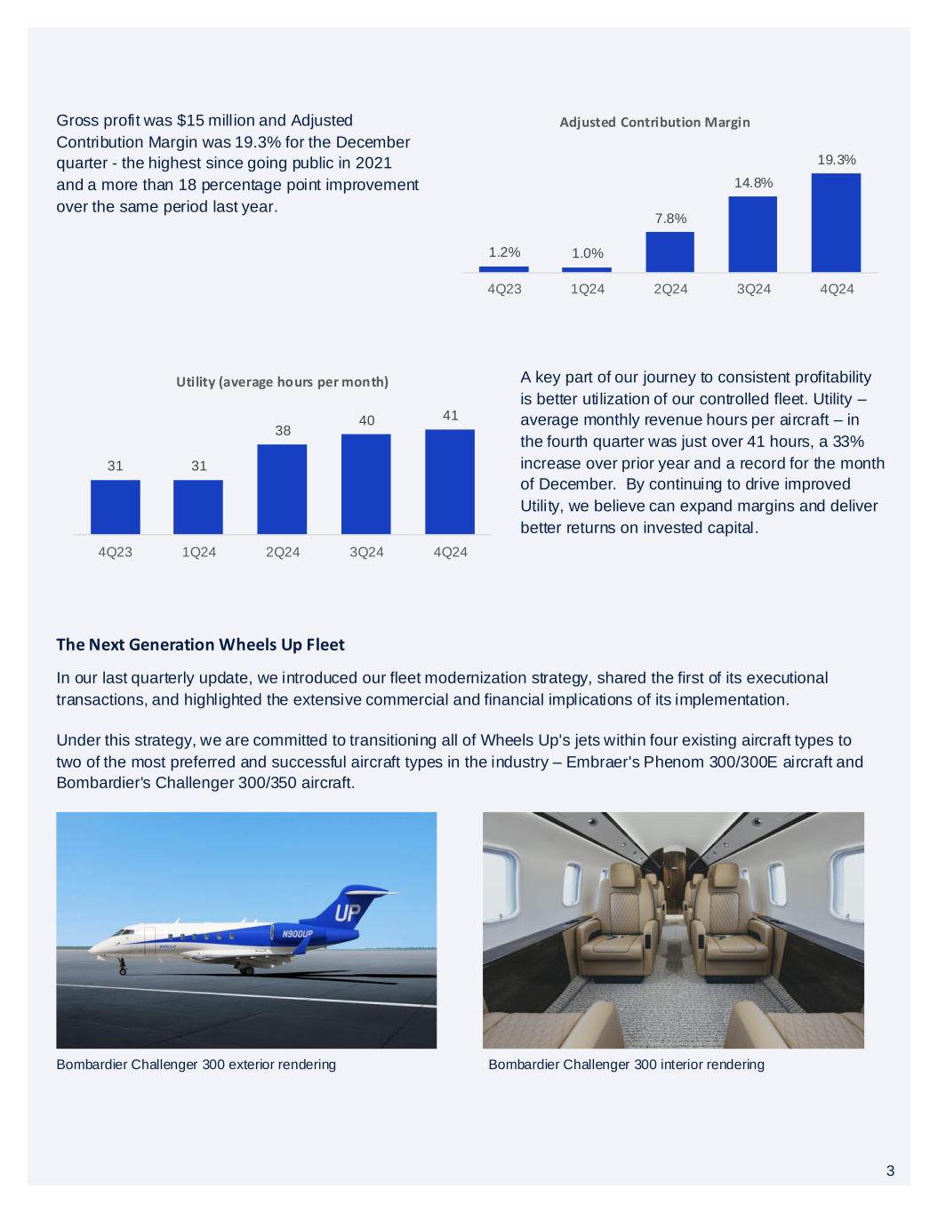 3 Gross profit was $15 million and Adjusted Contribution Margin was 19.3% for the December quarter - the highest since going public in 2021 and a more than 18 percentage point improvement over the same period last year. In our last quarterly update, we introduced our fleet modernization strategy, shared the first of its executional transactions, and highlighted the extensive commercial and financial implications of its implementation. The Next Generation Wheels Up Fleet Under this strategy, we are committed to transitioning all of Wheels Up's jets within four existing aircraft types to two of the most preferred and successful aircraft types in the industry – Embraer's Phenom 300/300E aircraft and Bombardier's Challenger 300/350 aircraft. 1.2% 1.0% 7.8% 14.8% 19.3% 4Q23 1Q24 2Q24 3Q24 4Q24 Adjusted Contribution Margin 31 31 38 40 41 4Q23 1Q24 2Q24 3Q24 4Q24 Utility (average hours per month) A key part of our journey to consistent profitability is better utilization of our controlled fleet. Utility – average monthly revenue hours per aircraft – in the fourth quarter was just over 41 hours, a 33% increase over prior year and a record for the month of December. By continuing to drive improved Utility, we believe can expand margins and deliver better returns on invested capital. Bombardier Challenger 300 exterior rendering Bombardier Challenger 300 interior rendering 3