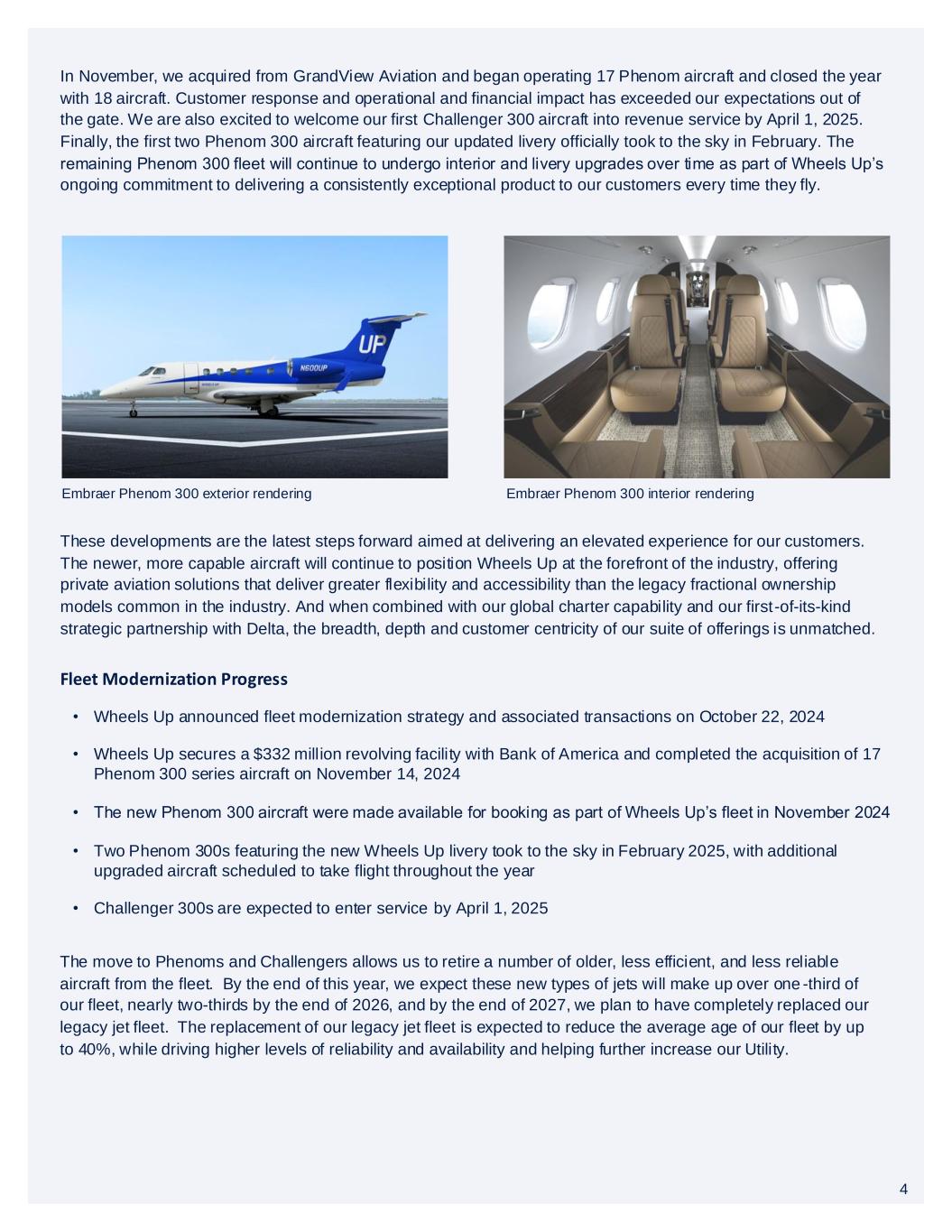 4 In November, we acquired from GrandView Aviation and began operating 17 Phenom aircraft and closed the year with 18 aircraft. Customer response and operational and financial impact has exceeded our expectations out of the gate. We are also excited to welcome our first Challenger 300 aircraft into revenue service by April 1, 2025. Finally, the first two Phenom 300 aircraft featuring our updated livery officially took to the sky in February. The remaining Phenom 300 fleet will continue to undergo interior and livery upgrades over time as part of Wheels Up’s ongoing commitment to delivering a consistently exceptional product to our customers every time they fly. These developments are the latest steps forward aimed at delivering an elevated experience for our customers. The newer, more capable aircraft will continue to position Wheels Up at the forefront of the industry, offering private aviation solutions that deliver greater flexibility and accessibility than the legacy fractional ownership models common in the industry. And when combined with our global charter capability and our first-of-its-kind strategic partnership with Delta, the breadth, depth and customer centricity of our suite of offerings is unmatched. Embraer Phenom 300 exterior rendering Embraer Phenom 300 interior rendering • Wheels Up announced fleet modernization strategy and associated transactions on October 22, 2024 • Wheels Up secures a $332 million revolving facility with Bank of America and completed the acquisition of 17 Phenom 300 series aircraft on November 14, 2024 • The new Phenom 300 aircraft were made available for booking as part of Wheels Up’s fleet in November 2024 • Two Phenom 300s featuring the new Wheels Up livery took to the sky in February 2025, with additional upgraded aircraft scheduled to take flight throughout the year • Challenger 300s are expected to enter service by April 1, 2025 Fleet Modernization Progress The move to Phenoms and Challengers allows us to retire a number of older, less efficient, and less reliable aircraft from the fleet. By the end of this year, we expect these new types of jets will make up over one -third of our fleet, nearly two-thirds by the end of 2026, and by the end of 2027, we plan to have completely replaced our legacy jet fleet. The replacement of our legacy jet fleet is expected to reduce the average age of our fleet by up to 40%, while driving higher levels of reliability and availability and helping further increase our Utility. 4