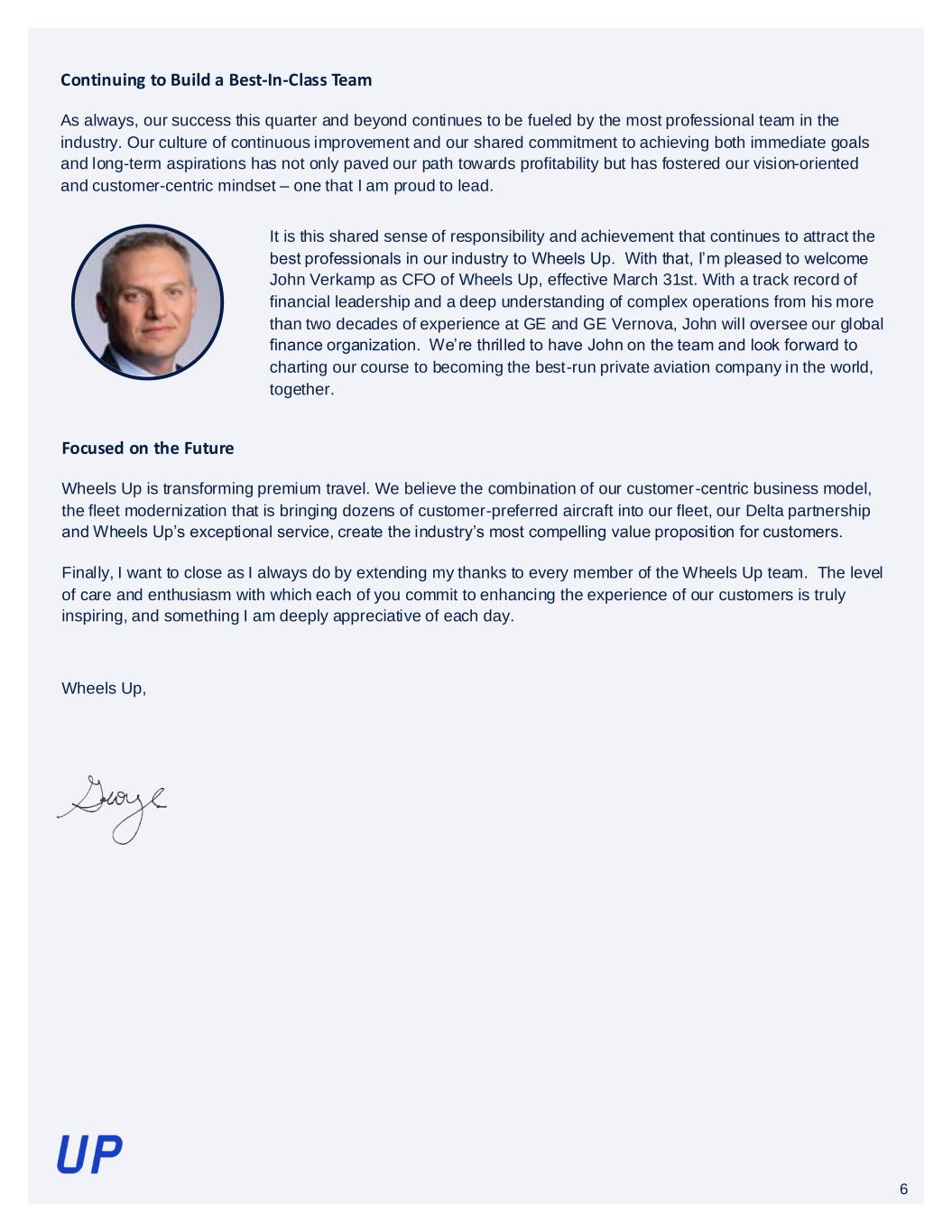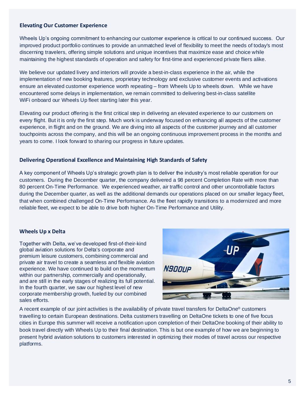 5 Wheels Up’s ongoing commitment to enhancing our customer experience is critical to our continued success. Our improved product portfolio continues to provide an unmatched level of flexibility to meet the needs of today's most discerning travelers, offering simple solutions and unique incentives that maximize ease and choice while maintaining the highest standards of operation and safety for first-time and experienced private fliers alike. We believe our updated livery and interiors will provide a best-in-class experience in the air, while the implementation of new booking features, proprietary technology and exclusive customer events and activations ensure an elevated customer experience worth repeating – from Wheels Up to wheels down. While we have encountered some delays in implementation, we remain committed to delivering best-in-class satellite WiFi onboard our Wheels Up fleet starting later this year. Elevating our product offering is the first critical step in delivering an elevated experience to our customers on every flight. But it is only the first step. Much work is underway focused on enhancing all aspects of the customer experience, in flight and on the ground. We are diving into all aspects of the customer journey and all customer touchpoints across the company, and this will be an ongoing continuous improvement process in the months and years to come. I look forward to sharing our progress in future updates. Elevating Our Customer Experience A key component of Wheels Up’s strategic growth plan is to deliver the industry’s most reliable operation for our customers. During the December quarter, the company delivered a 98 percent Completion Rate with more than 80 percent On-Time Performance. We experienced weather, air traffic control and other uncontrollable factors during the December quarter, as well as the additional demands our operations placed on our smaller legacy fleet, that when combined challenged On-Time Performance. As the fleet rapidly transitions to a modernized and more reliable fleet, we expect to be able to drive both higher On-Time Performance and Utility. Delivering Operational Excellence and Maintaining High Standards of Safety A recent example of our joint activities is the availability of private travel transfers for DeltaOne® customers travelling to certain European destinations. Delta customers travelling on DeltaOne tickets to one of five focus cities in Europe this summer will receive a notification upon completion of their DeltaOne booking of their ability to book travel directly with Wheels Up to their final destination. This is but one example of how we are beginning to present hybrid aviation solutions to customers interested in optimizing their modes of travel across our respective platforms. Together with Delta, we’ve developed first-of-their-kind global aviation solutions for Delta's corporate and premium leisure customers, combining commercial and private air travel to create a seamless and flexible aviation experience. We have continued to build on the momentum within our partnership, commercially and operationally, and are still in the early stages of realizing its full potential. In the fourth quarter, we saw our highest level of new corporate membership growth, fueled by our combined sales efforts. Wheels Up x Delta 5