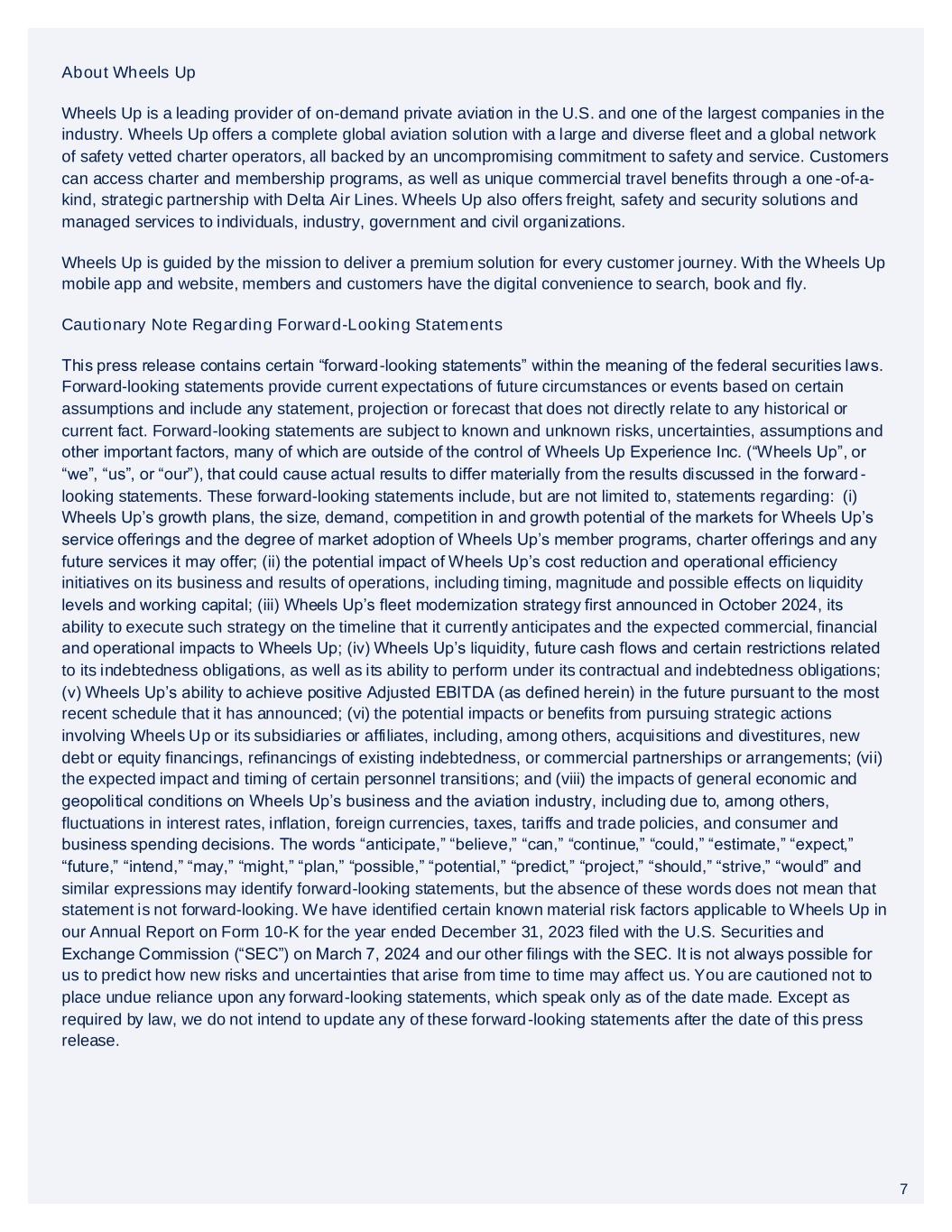 7 About Wheels Up Wheels Up is a leading provider of on-demand private aviation in the U.S. and one of the largest companies in the industry. Wheels Up offers a complete global aviation solution with a large and diverse fleet and a global network of safety vetted charter operators, all backed by an uncompromising commitment to safety and service. Customers can access charter and membership programs, as well as unique commercial travel benefits through a one -of-a- kind, strategic partnership with Delta Air Lines. Wheels Up also offers freight, safety and security solutions and managed services to individuals, industry, government and civil organizations. Wheels Up is guided by the mission to deliver a premium solution for every customer journey. With the Wheels Up mobile app and website, members and customers have the digital convenience to search, book and fly. Cautionary Note Regarding Forward-Looking Statements This press release contains certain “forward-looking statements” within the meaning of the federal securities laws. Forward-looking statements provide current expectations of future circumstances or events based on certain assumptions and include any statement, projection or forecast that does not directly relate to any historical or current fact. Forward-looking statements are subject to known and unknown risks, uncertainties, assumptions and other important factors, many of which are outside of the control of Wheels Up Experience Inc. (“Wheels Up”, or “we”, “us”, or “our”), that could cause actual results to differ materially from the results discussed in the forward - looking statements. These forward-looking statements include, but are not limited to, statements regarding: (i) Wheels Up’s growth plans, the size, demand, competition in and growth potential of the markets for Wheels Up’s service offerings and the degree of market adoption of Wheels Up’s member programs, charter offerings and any future services it may offer; (ii) the potential impact of Wheels Up’s cost reduction and operational efficiency initiatives on its business and results of operations, including timing, magnitude and possible effects on liquidity levels and working capital; (iii) Wheels Up’s fleet modernization strategy first announced in October 2024, its ability to execute such strategy on the timeline that it currently anticipates and the expected commercial, financial and operational impacts to Wheels Up; (iv) Wheels Up’s liquidity, future cash flows and certain restrictions related to its indebtedness obligations, as well as its ability to perform under its contractual and indebtedness obligations; (v) Wheels Up’s ability to achieve positive Adjusted EBITDA (as defined herein) in the future pursuant to the most recent schedule that it has announced; (vi) the potential impacts or benefits from pursuing strategic actions involving Wheels Up or its subsidiaries or affiliates, including, among others, acquisitions and divestitures, new debt or equity financings, refinancings of existing indebtedness, or commercial partnerships or arrangements; (vii) the expected impact and timing of certain personnel transitions; and (viii) the impacts of general economic and geopolitical conditions on Wheels Up’s business and the aviation industry, including due to, among others, fluctuations in interest rates, inflation, foreign currencies, taxes, tariffs and trade policies, and consumer and business spending decisions. The words “anticipate,” “believe,” “can,” “continue,” “could,” “estimate,” “expect,” “future,” “intend,” “may,” “might,” “plan,” “possible,” “potential,” “predict,” “project,” “should,” “strive,” “would” and similar expressions may identify forward-looking statements, but the absence of these words does not mean that statement is not forward-looking. We have identified certain known material risk factors applicable to Wheels Up in our Annual Report on Form 10-K for the year ended December 31, 2023 filed with the U.S. Securities and Exchange Commission (“SEC”) on March 7, 2024 and our other filings with the SEC. It is not always possible for us to predict how new risks and uncertainties that arise from time to time may affect us. You are cautioned not to place undue reliance upon any forward-looking statements, which speak only as of the date made. Except as required by law, we do not intend to update any of these forward-looking statements after the date of this press release. 7