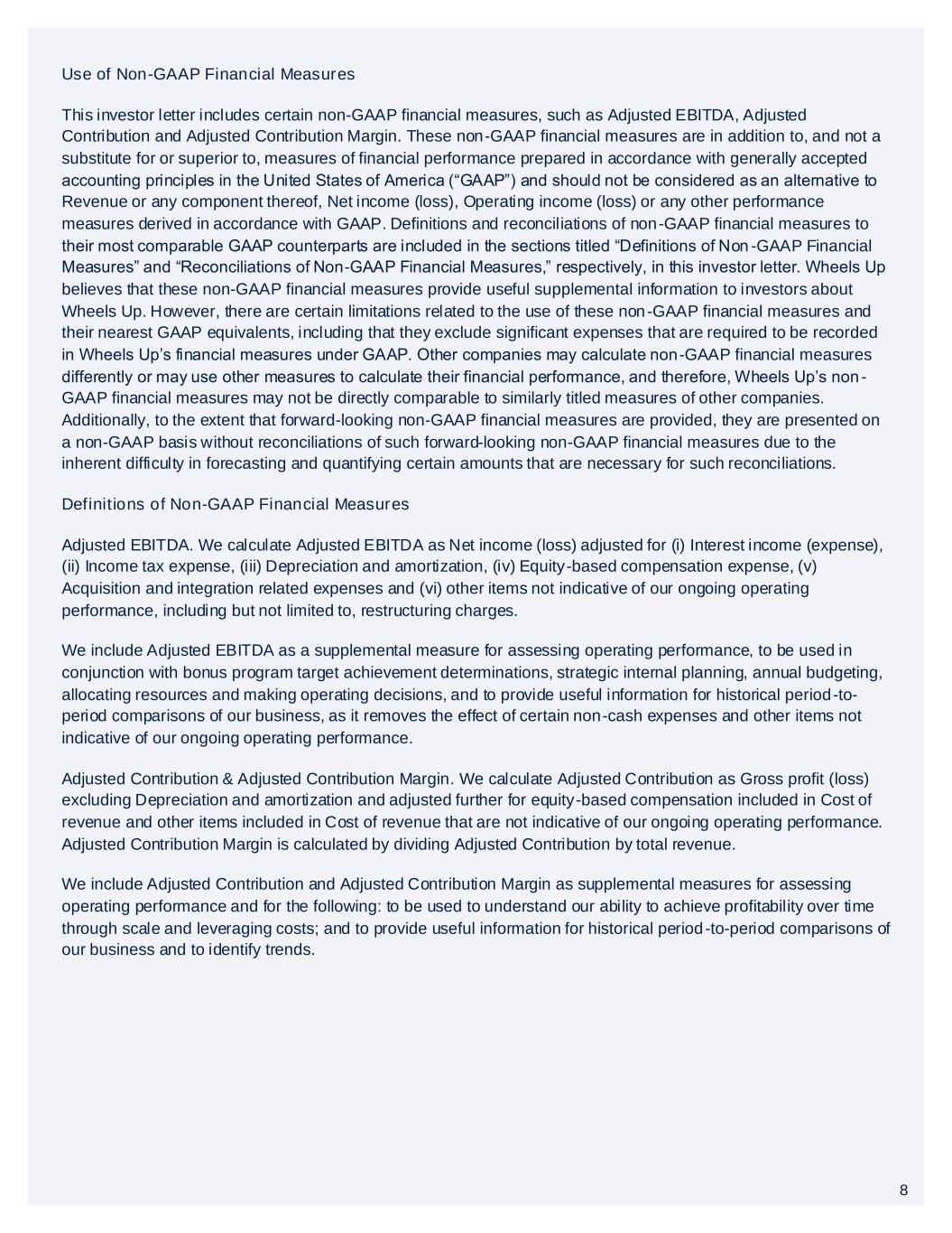 8 Use of Non-GAAP Financial Measures This investor letter includes certain non-GAAP financial measures, such as Adjusted EBITDA, Adjusted Contribution and Adjusted Contribution Margin. These non-GAAP financial measures are in addition to, and not a substitute for or superior to, measures of financial performance prepared in accordance with generally accepted accounting principles in the United States of America (“GAAP”) and should not be considered as an alternative to Revenue or any component thereof, Net income (loss), Operating income (loss) or any other performance measures derived in accordance with GAAP. Definitions and reconciliations of non-GAAP financial measures to their most comparable GAAP counterparts are included in the sections titled “Definitions of Non -GAAP Financial Measures” and “Reconciliations of Non-GAAP Financial Measures,” respectively, in this investor letter. Wheels Up believes that these non-GAAP financial measures provide useful supplemental information to investors about Wheels Up. However, there are certain limitations related to the use of these non-GAAP financial measures and their nearest GAAP equivalents, including that they exclude significant expenses that are required to be recorded in Wheels Up’s financial measures under GAAP. Other companies may calculate non-GAAP financial measures differently or may use other measures to calculate their financial performance, and therefore, Wheels Up’s non - GAAP financial measures may not be directly comparable to similarly titled measures of other companies. Additionally, to the extent that forward-looking non-GAAP financial measures are provided, they are presented on a non-GAAP basis without reconciliations of such forward-looking non-GAAP financial measures due to the inherent difficulty in forecasting and quantifying certain amounts that are necessary for such reconciliations. Definitions of Non-GAAP Financial Measures Adjusted EBITDA. We calculate Adjusted EBITDA as Net income (loss) adjusted for (i) Interest income (expense), (ii) Income tax expense, (iii) Depreciation and amortization, (iv) Equity-based compensation expense, (v) Acquisition and integration related expenses and (vi) other items not indicative of our ongoing operating performance, including but not limited to, restructuring charges. We include Adjusted EBITDA as a supplemental measure for assessing operating performance, to be used in conjunction with bonus program target achievement determinations, strategic internal planning, annual budgeting, allocating resources and making operating decisions, and to provide useful information for historical period-to- period comparisons of our business, as it removes the effect of certain non-cash expenses and other items not indicative of our ongoing operating performance. Adjusted Contribution & Adjusted Contribution Margin. We calculate Adjusted Contribution as Gross profit (loss) excluding Depreciation and amortization and adjusted further for equity-based compensation included in Cost of revenue and other items included in Cost of revenue that are not indicative of our ongoing operating performance. Adjusted Contribution Margin is calculated by dividing Adjusted Contribution by total revenue. We include Adjusted Contribution and Adjusted Contribution Margin as supplemental measures for assessing operating performance and for the following: to be used to understand our ability to achieve profitability over time through scale and leveraging costs; and to provide useful information for historical period-to-period comparisons of our business and to identify trends. 8