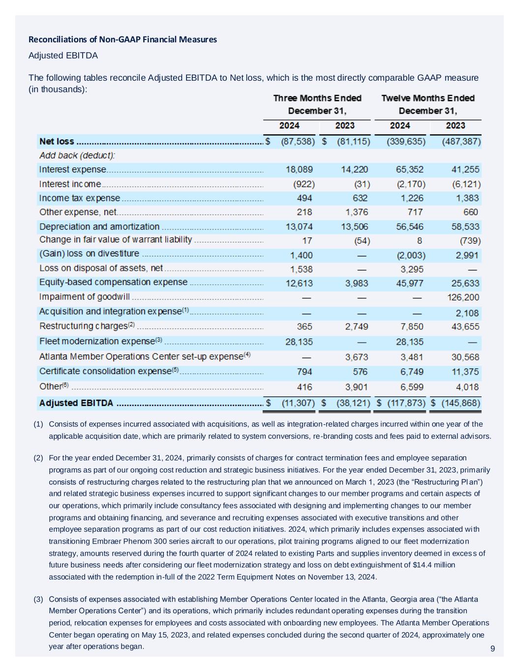 9 Adjusted EBITDA The following tables reconcile Adjusted EBITDA to Net loss, which is the most directly comparable GAAP measure (in thousands): Reconciliations of Non-GAAP Financial Measures (1) Consists of expenses incurred associated with acquisitions, as well as integration-related charges incurred within one year of the applicable acquisition date, which are primarily related to system conversions, re-branding costs and fees paid to external advisors. (2) For the year ended December 31, 2024, primarily consists of charges for contract termination fees and employee separation programs as part of our ongoing cost reduction and strategic business initiatives. For the year ended December 31, 2023, primarily consists of restructuring charges related to the restructuring plan that we announced on March 1, 2023 (the “Restructuring Pl an”) and related strategic business expenses incurred to support significant changes to our member programs and certain aspects of our operations, which primarily include consultancy fees associated with designing and implementing changes to our member programs and obtaining financing, and severance and recruiting expenses associated with executive transitions and other employee separation programs as part of our cost reduction initiatives. 2024, which primarily includes expenses associated wi th transitioning Embraer Phenom 300 series aircraft to our operations, pilot training programs aligned to our fleet modernization strategy, amounts reserved during the fourth quarter of 2024 related to existing Parts and supplies inventory deemed in excess of future business needs after considering our fleet modernization strategy and loss on debt extinguishment of $14.4 million associated with the redemption in-full of the 2022 Term Equipment Notes on November 13, 2024. (3) Consists of expenses associated with establishing Member Operations Center located in the Atlanta, Georgia area (“the Atlanta Member Operations Center”) and its operations, which primarily includes redundant operating expenses during the transition period, relocation expenses for employees and costs associated with onboarding new employees. The Atlanta Member Operations Center began operating on May 15, 2023, and related expenses concluded during the second quarter of 2024, approximately one year after operations began. 9