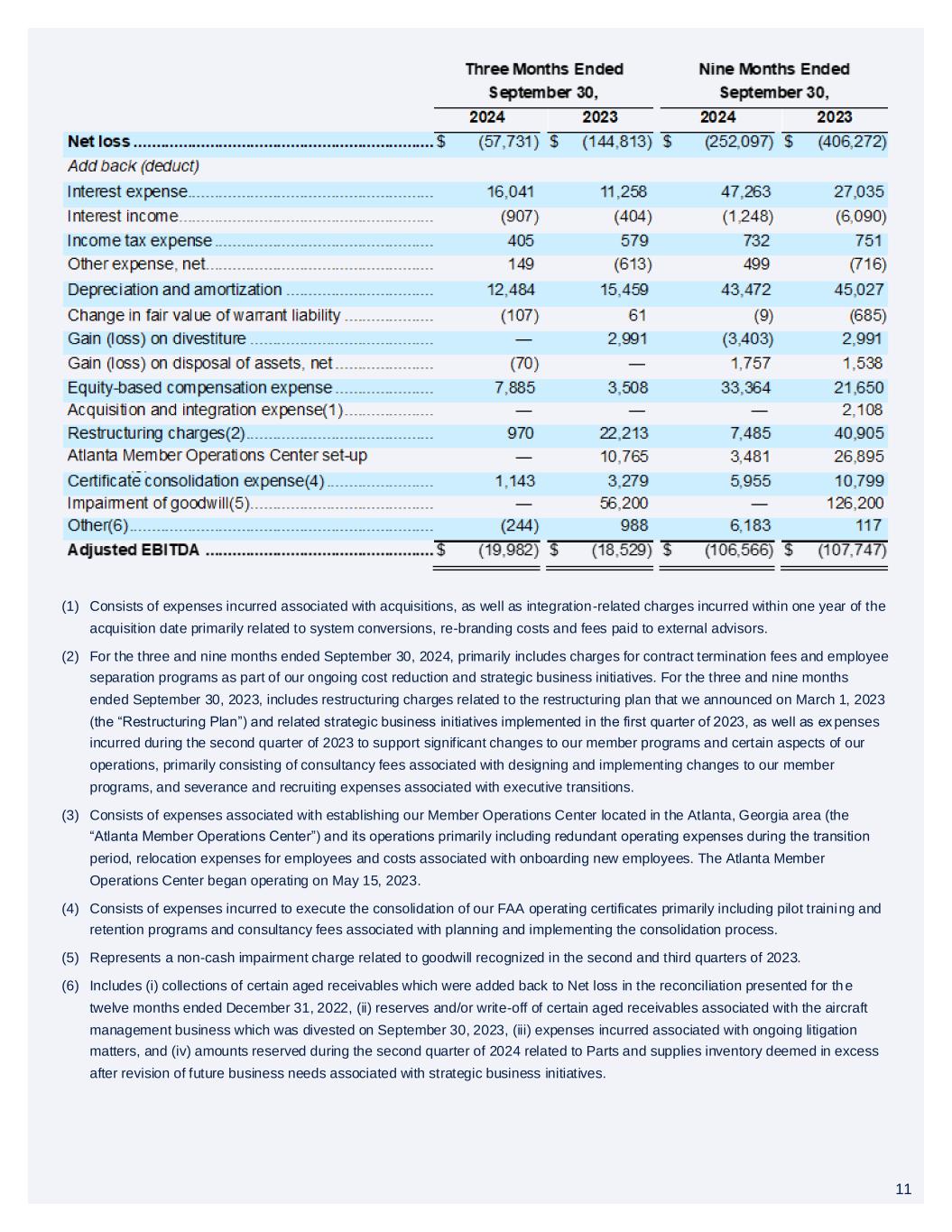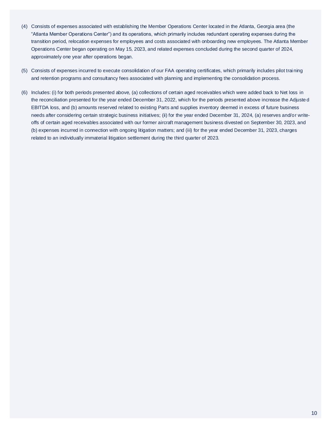 10 (4) Consists of expenses associated with establishing the Member Operations Center located in the Atlanta, Georgia area (the “Atlanta Member Operations Center”) and its operations, which primarily includes redundant operating expenses during the transition period, relocation expenses for employees and costs associated with onboarding new employees. The Atlanta Member Operations Center began operating on May 15, 2023, and related expenses concluded during the second quarter of 2024, approximately one year after operations began. (5) Consists of expenses incurred to execute consolidation of our FAA operating certificates, which primarily includes pilot trai ning and retention programs and consultancy fees associated with planning and implementing the consolidation process. (6) Includes: (i) for both periods presented above, (a) collections of certain aged receivables which were added back to Net loss in the reconciliation presented for the year ended December 31, 2022, which for the periods presented above increase the Adjuste d EBITDA loss, and (b) amounts reserved related to existing Parts and supplies inventory deemed in excess of future business needs after considering certain strategic business initiatives; (ii) for the year ended December 31, 2024, (a) reserves and/or write- offs of certain aged receivables associated with our former aircraft management business divested on September 30, 2023, and (b) expenses incurred in connection with ongoing litigation matters; and (iii) for the year ended December 31, 2023, charges related to an individually immaterial litigation settlement during the third quarter of 2023. 10
