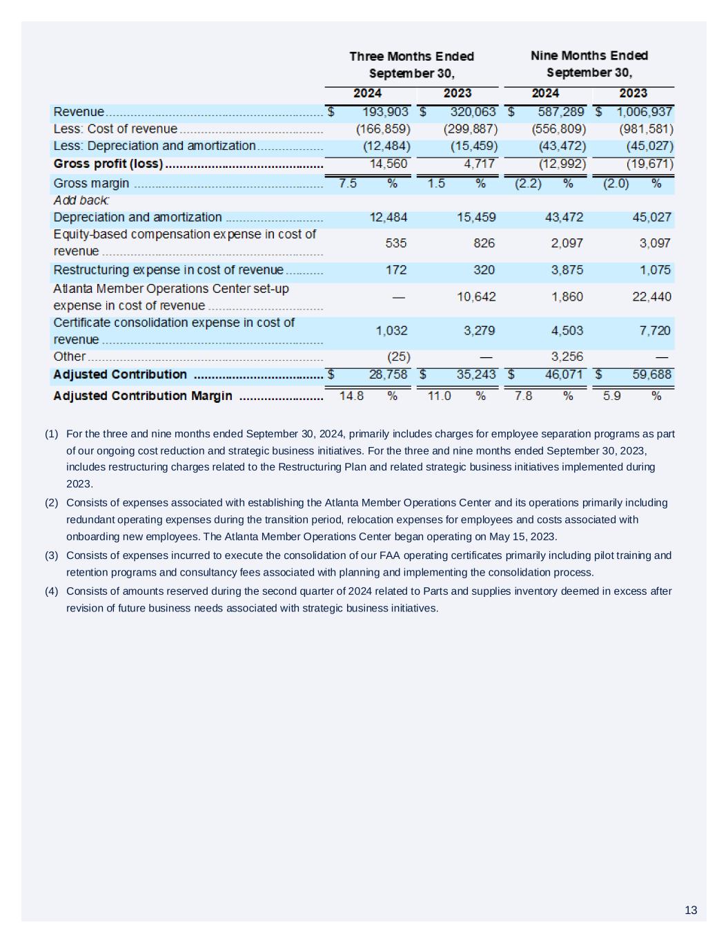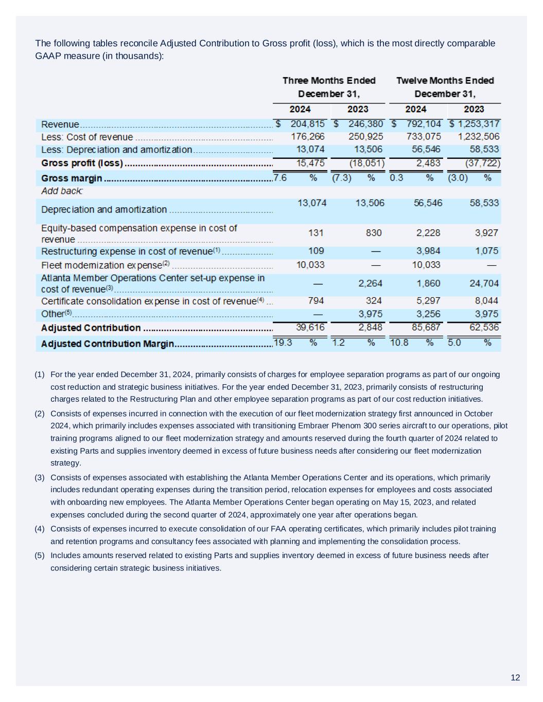 12 The following tables reconcile Adjusted Contribution to Gross profit (loss), which is the most directly comparable GAAP measure (in thousands): (1) For the year ended December 31, 2024, primarily consists of charges for employee separation programs as part of our ongoing cost reduction and strategic business initiatives. For the year ended December 31, 2023, primarily consists of restructuring charges related to the Restructuring Plan and other employee separation programs as part of our cost reduction initiatives. (2) Consists of expenses incurred in connection with the execution of our fleet modernization strategy first announced in October 2024, which primarily includes expenses associated with transitioning Embraer Phenom 300 series aircraft to our operations, pilot training programs aligned to our fleet modernization strategy and amounts reserved during the fourth quarter of 2024 related to existing Parts and supplies inventory deemed in excess of future business needs after considering our fleet modernization strategy. (3) Consists of expenses associated with establishing the Atlanta Member Operations Center and its operations, which primarily includes redundant operating expenses during the transition period, relocation expenses for employees and costs associated with onboarding new employees. The Atlanta Member Operations Center began operating on May 15, 2023, and related expenses concluded during the second quarter of 2024, approximately one year after operations began. (4) Consists of expenses incurred to execute consolidation of our FAA operating certificates, which primarily includes pilot training and retention programs and consultancy fees associated with planning and implementing the consolidation process. (5) Includes amounts reserved related to existing Parts and supplies inventory deemed in excess of future business needs after considering certain strategic business initiatives. 12