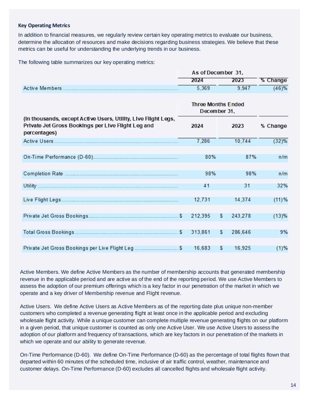 14 In addition to financial measures, we regularly review certain key operating metrics to evaluate our business, determine the allocation of resources and make decisions regarding business strategies. We believe that these metrics can be useful for understanding the underlying trends in our business. The following table summarizes our key operating metrics: Key Operating Metrics Active Members. We define Active Members as the number of membership accounts that generated membership revenue in the applicable period and are active as of the end of the reporting period. We use Active Members to assess the adoption of our premium offerings which is a key factor in our penetration of the market in which we operate and a key driver of Membership revenue and Flight revenue. Active Users. We define Active Users as Active Members as of the reporting date plus unique non-member customers who completed a revenue generating flight at least once in the applicable period and excluding wholesale flight activity. While a unique customer can complete multiple revenue generating flights on our platform in a given period, that unique customer is counted as only one Active User. We use Active Users to assess the adoption of our platform and frequency of transactions, which are key factors in our penetration of the markets in which we operate and our ability to generate revenue. On-Time Performance (D-60). We define On-Time Performance (D-60) as the percentage of total flights flown that departed within 60 minutes of the scheduled time, inclusive of air traffic control, weather, maintenance and customer delays. On-Time Performance (D-60) excludes all cancelled flights and wholesale flight activity. 14